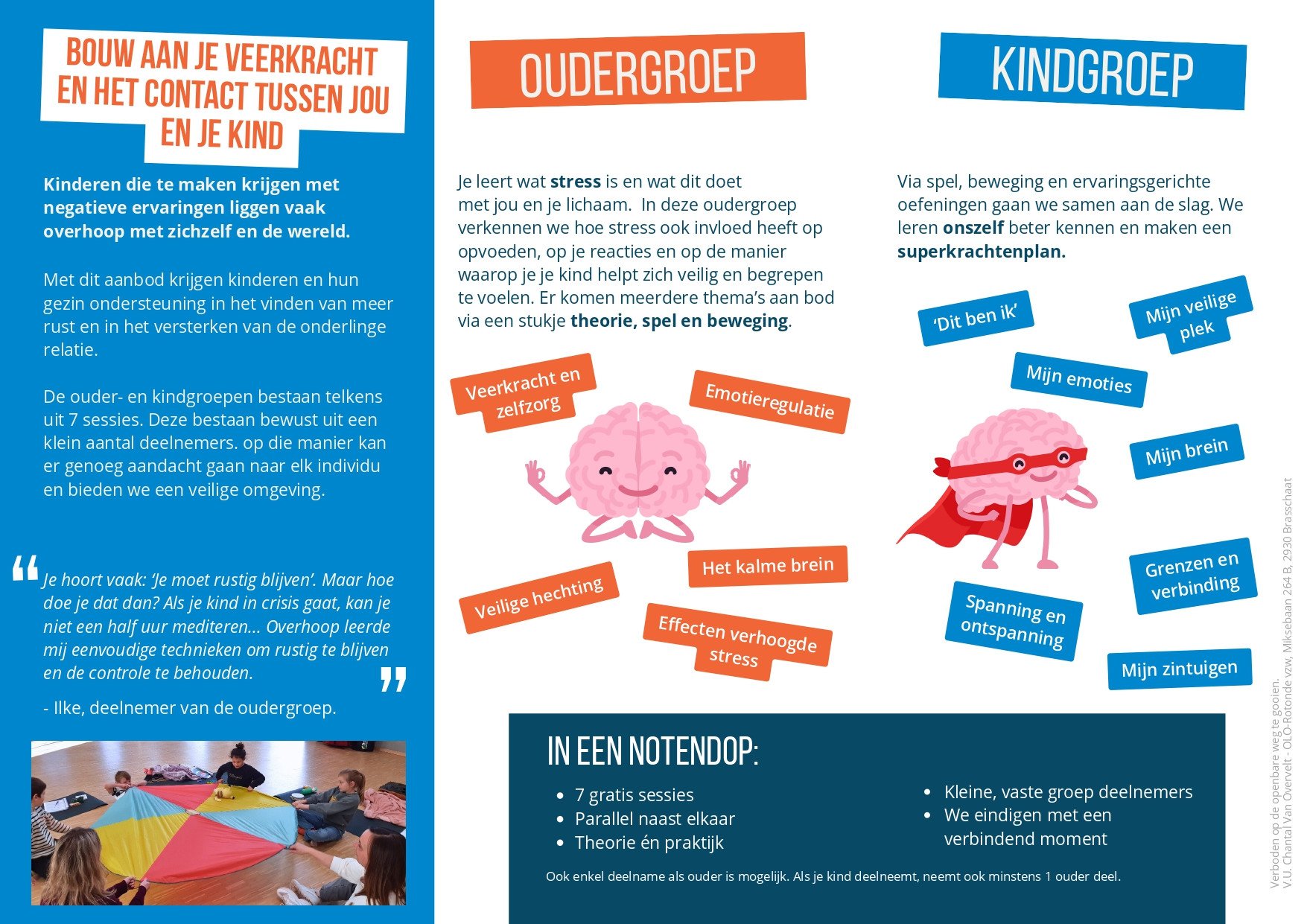 In 7 gratis sessies wordt er parallel een vaste oudergroep en kindgroep aangeboden. Elke sessie duurt 2 uur. Apart gaan zij aan de slag rond stress en veerkracht. Na elke sessie wordt er een verbindende oefening over de groepjes heen gedaan.