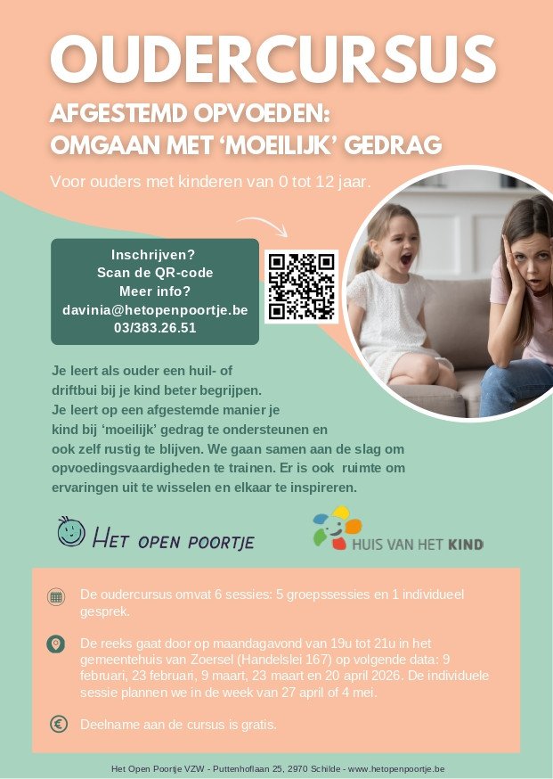 - Je leert op een afgestemde manier kind bij ‘moeilijk’ gedrag te ondersteunen en ook zelf rustig te blijven.