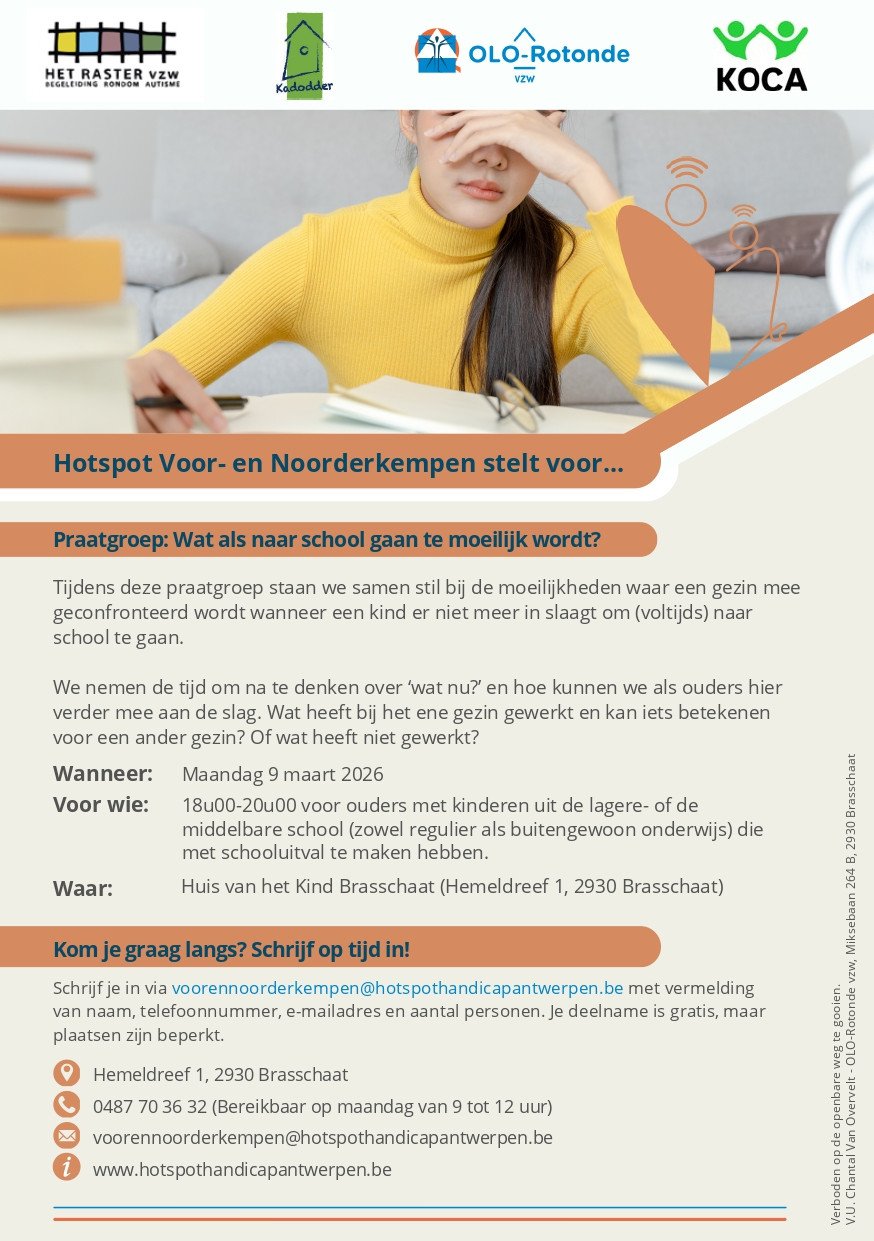 Tijdens deze praatgroep staan we samen stil bij de moeilijkheden waar een gezin mee geconfronteerd wordt wanneer een kind er niet meer in slaagt om (voltijds) naar school te gaan.