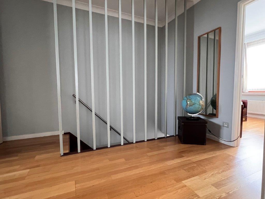 Op de 1e verdieping bevinden zich 3 ruime slaapkamers (14 m², 10 m², 8 m²) voorzien van ingemaakte kasten en een badkamer met lavabo, toilet en douche.