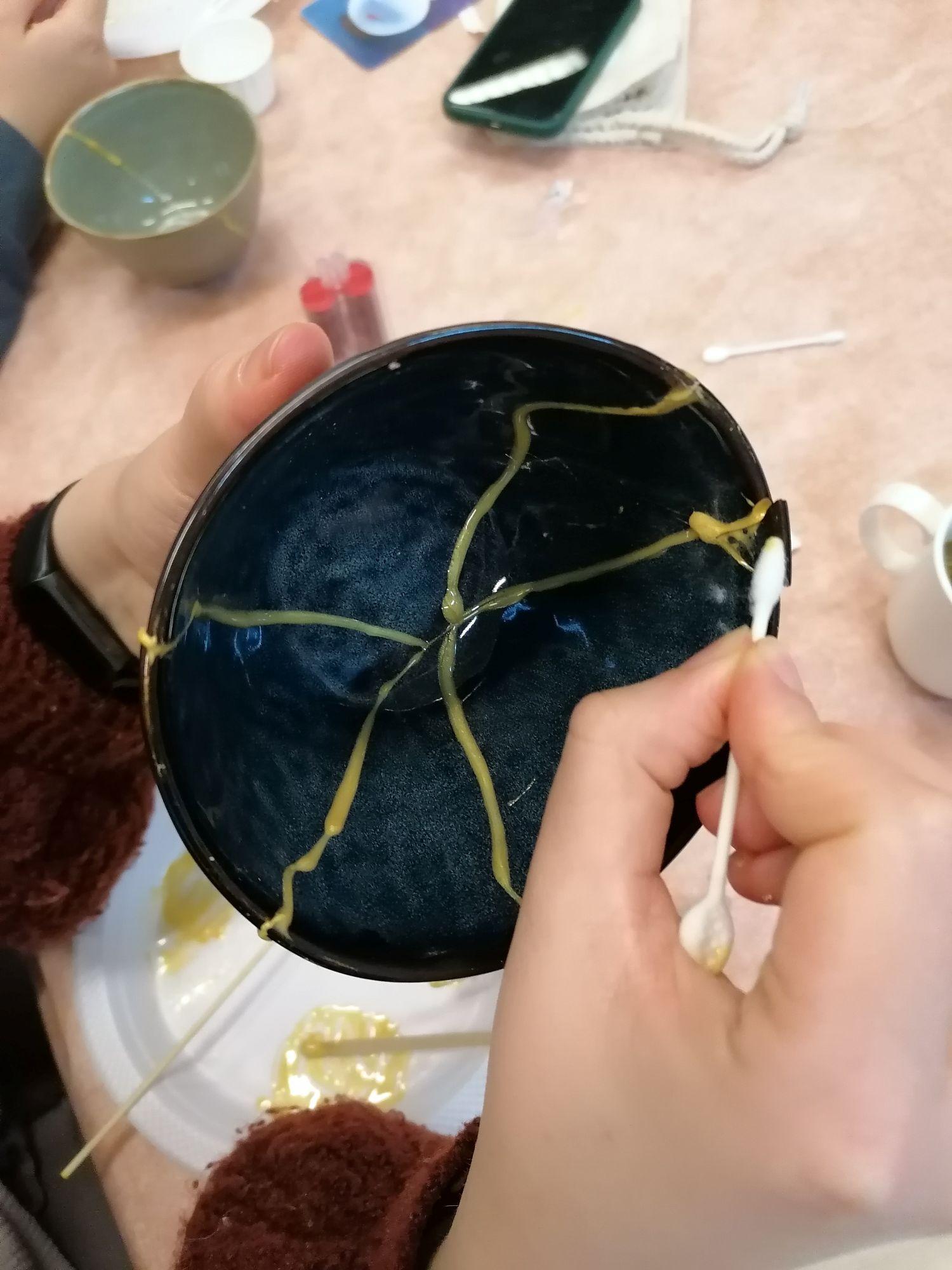 Kintsugi is een Japanse kunstvorm waarin gebroken aardewerk wordt hersteld. Je verbindt de scherven met gouden lijm tot een nieuw en authentiek geheel.