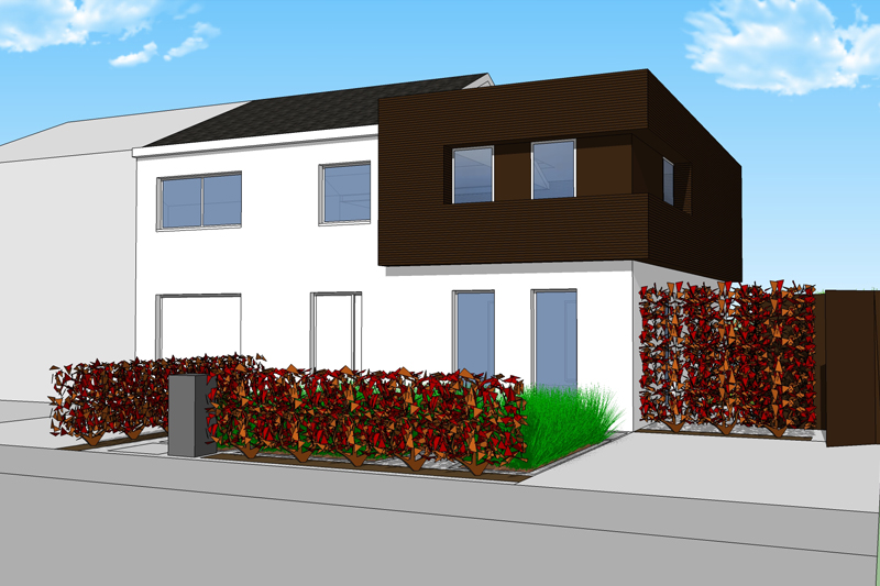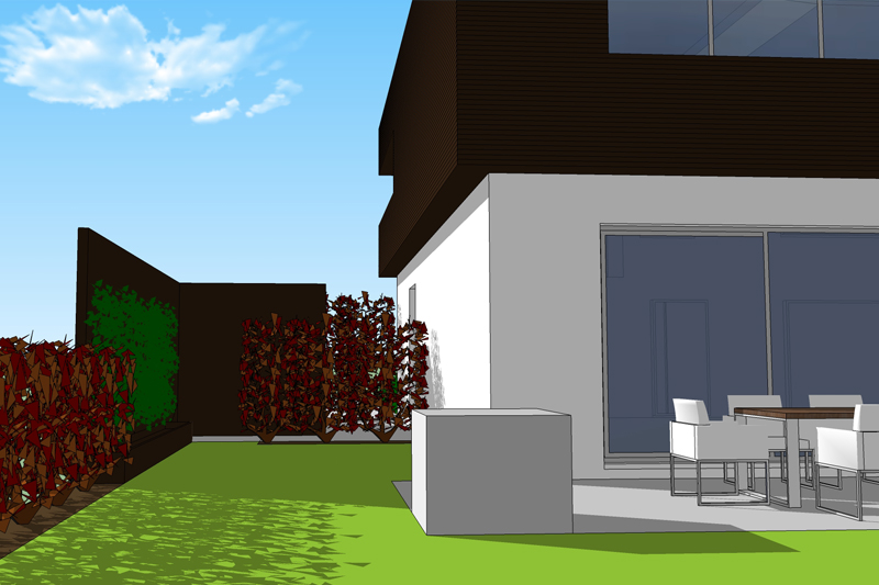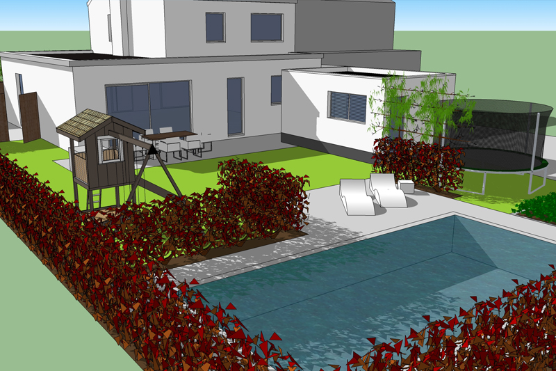 Ontwerp van een tuin bij een halfopen bebouwing. De tuin op zich diende enkele speeltoestellen te bevatten voor de kinderen alsook een zwembad.