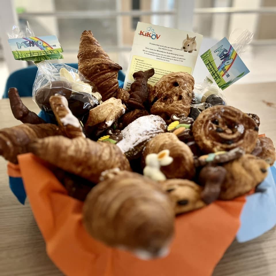 Daarom komen wij ’s morgens langs met een feestelijke ontbijtmand, met paaseitjes natuurlijk, maar ook met croissants, koffiekoeken, sandwiches en pistolets, en met lekker fruitsap en een grote keuze aan beleg, … voor elk wat wils.