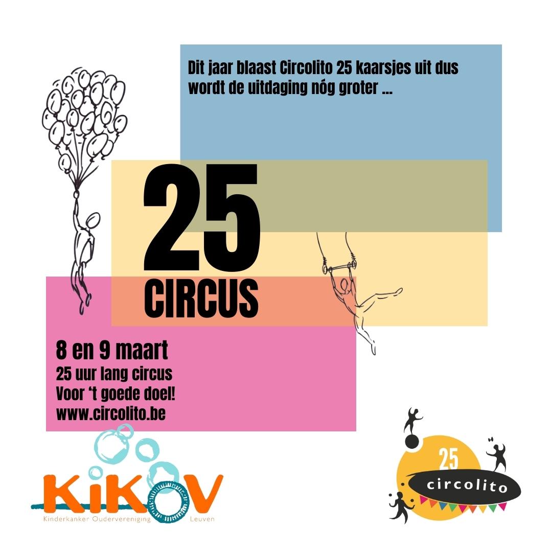 De Circolito's (dat zijn de leerlingen, de lesgevers, de medewerkers, maar eigenlijk ook de sympathisanten van circusatelier Circolito uit Mechelen) hebben een groot hart. En ze doen graag circus. En dus circussen ze regelmatig ten voordele van een goed doel. Normaal gezien houden ze dat dan 24 uur vol, maar omdat Circolito dot jaar 25 jaar bestaat, gaan ze voor 25 uur non-stop circus! 't Is te zeggen, van zaterdag 8 maart 16u tot zondag 9 maart 17u staan de deuren open voor iedereen die zich laat sponsoren door vrienden, familie, buren, ...en in ruil voor die sponsoring komt circussen.