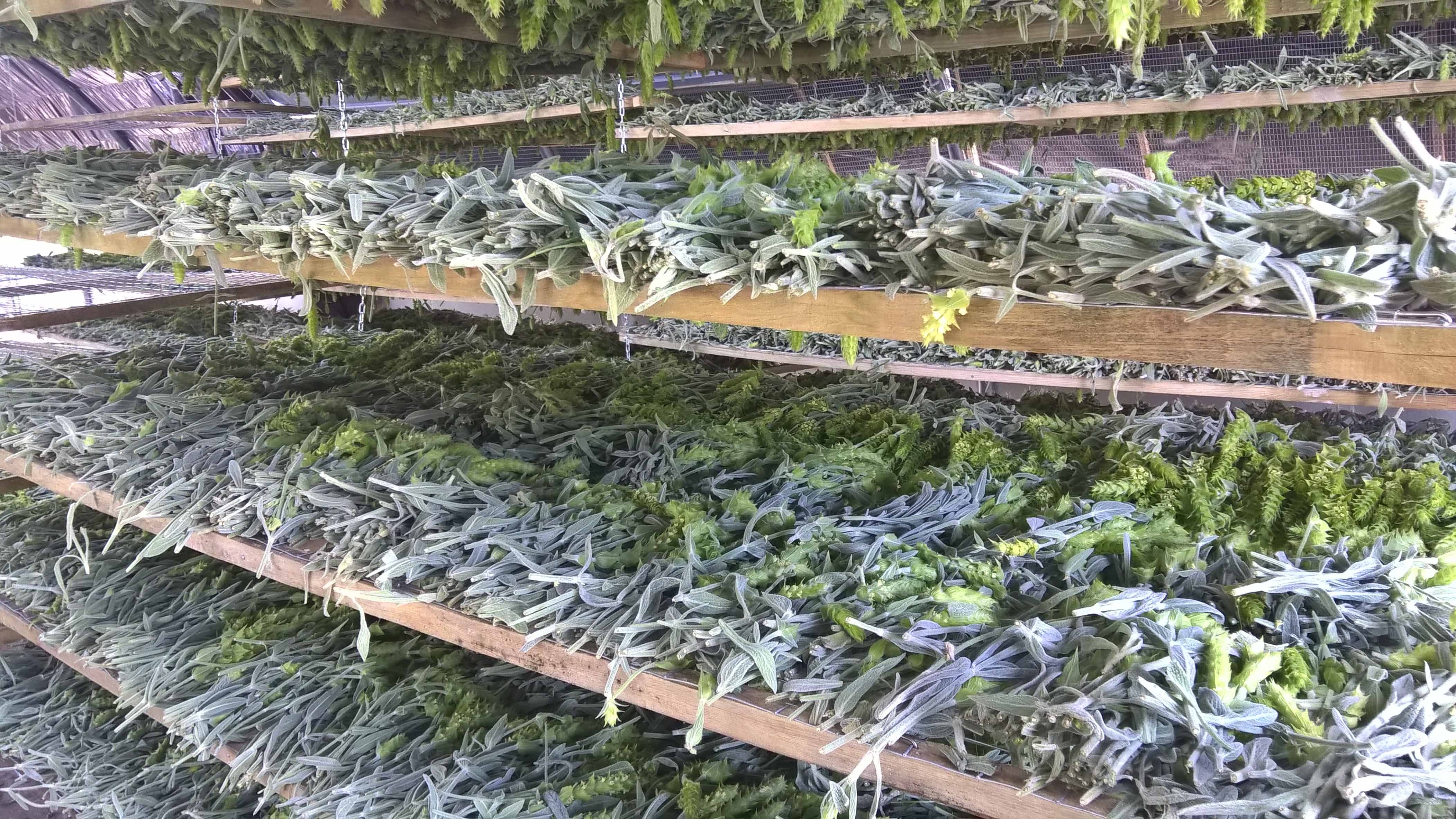 Dan gaan ze snel onze droogtunnels in, op het veld. Naargelang de buitentemeratuur duurt het droogproces tussen 3 en 15 dagen. We houden de hitte onder 42°C want als het te warm is verliezen we de essentiële oliën en de kracht van de Griekse bergthee.