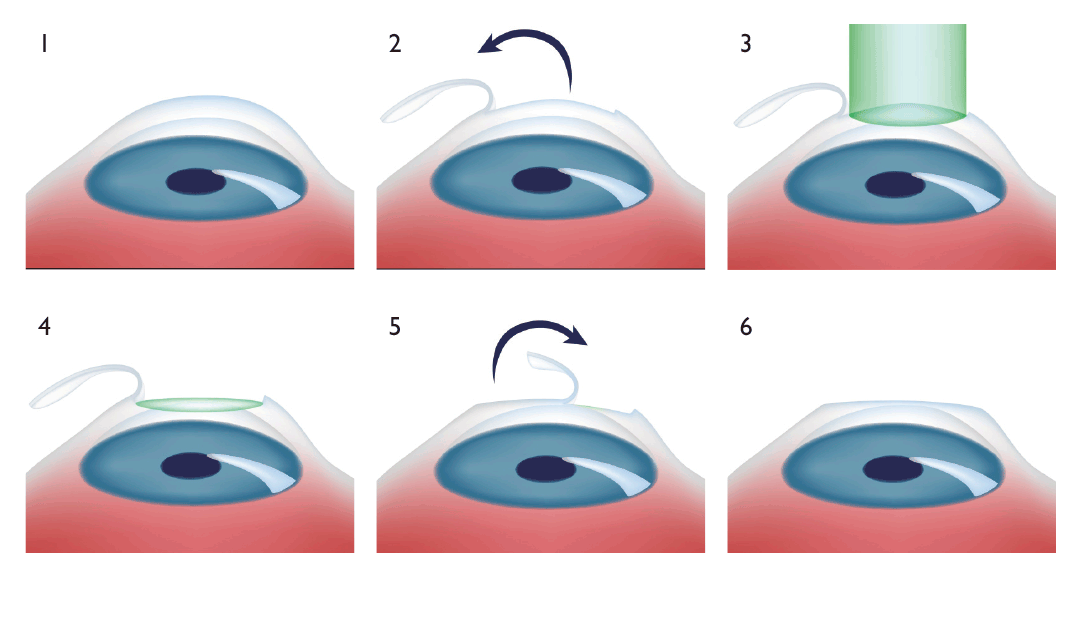 De procedure zelf verloopt in twee fasen: vooreerst wordt een oppervlakkig laagje hoornvlies vrijgemaakt met behulp van de femtolaser of het microkeratoom.