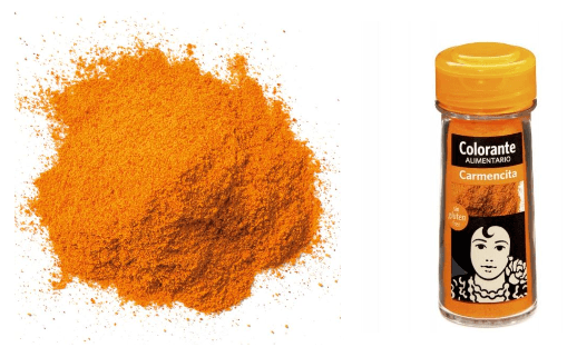 Saffraan en gerookt paprikapoeder geven natuurlijk ook kleur maar vele mensen gebruiken daarnaast ook colorante om een fellere geel-oranje kleur te bekomen.