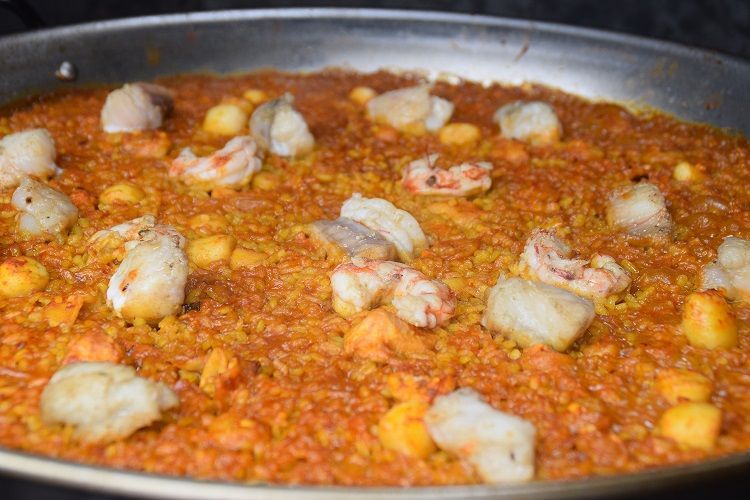 Bij vis wordt best gekozen voor een stevige vis die bij het begin wordt gebakken en dan aan het einde weer toegevoegd. Voor gamba's geldt hetzelfde, bak ze met de schaal en indien mogelijk ook de kop die veel smaak afgeven, en voeg ze aan het einde (al dan niet gepeld) weer toe zodat ze niet uitdrogen. Intktvis wordt heel vaak gebruikt in paella, het heeft dikwijls zelf niet heel veel smaak maar geeft wel veel smaak af aan de bouillon, net zoals het vocht van mosselen en schelpen. Kreeft of sint-jacobsvruchten zijn feestelijke opties.