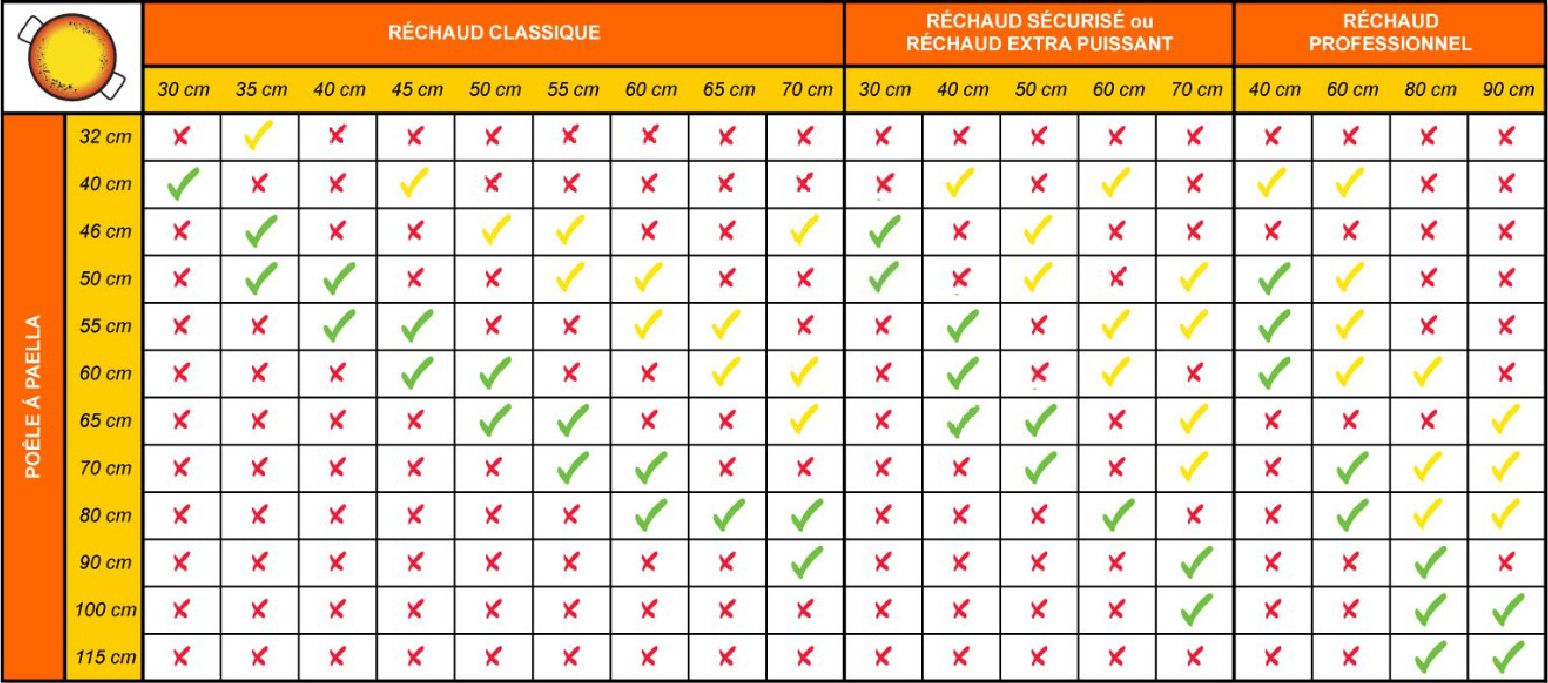 Le schéma ci-dessous indique quelles poêles à paella et quels brûleurs à gaz sont compatibles entre eux :
