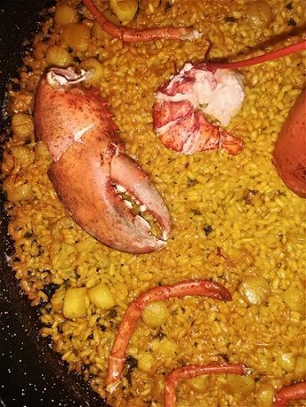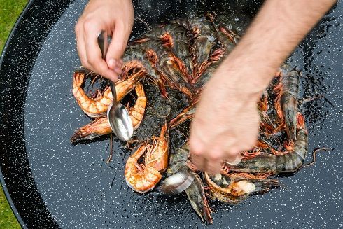 Bij vis wordt best gekozen voor een stevige vis die bij het begin wordt gebakken en dan aan het einde weer toegevoegd. Voor gamba's geldt hetzelfde, bak ze met de schaal en indien mogelijk ook de kop die veel smaak afgeven, en voeg ze aan het einde (al dan niet gepeld) weer toe zodat ze niet uitdrogen. Intktvis wordt heel vaak gebruikt in paella en geeft veel smaak af, net zoals het vocht van mosselen en schelpen. Kreeft of sint-jacobsvruchten zijn feestelijke opties.