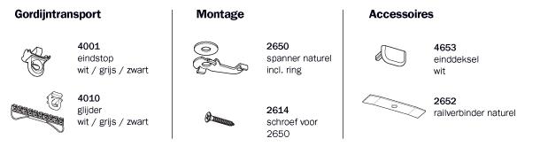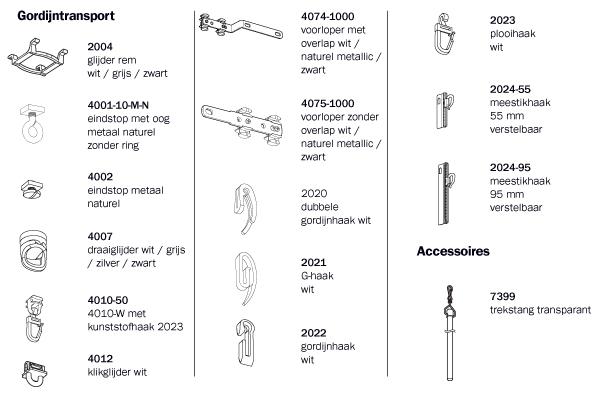 Glijder 4010 is verkrijgbaar met diverse haaksoorten. Eindstop metaal met of zonder oog. LRS glijders 4007-LR. Glijderrem 2004. Schroef 2614 (3,0 x 20 mm) voor spanner 2650. Voorloper met overlap 4074-1000 of zonder overlap 4075-1000.