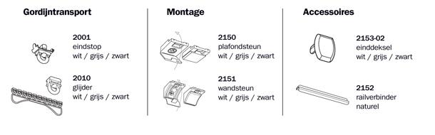 Goelst zelfsmerende, UV bestendige glijders gemaakt van hoogwaardige kunststof. Per meter 12 glijders 2010, per lengte 2 eindstops 2001 en 2 einddeksels 2153-02. Railverbinder 2152.