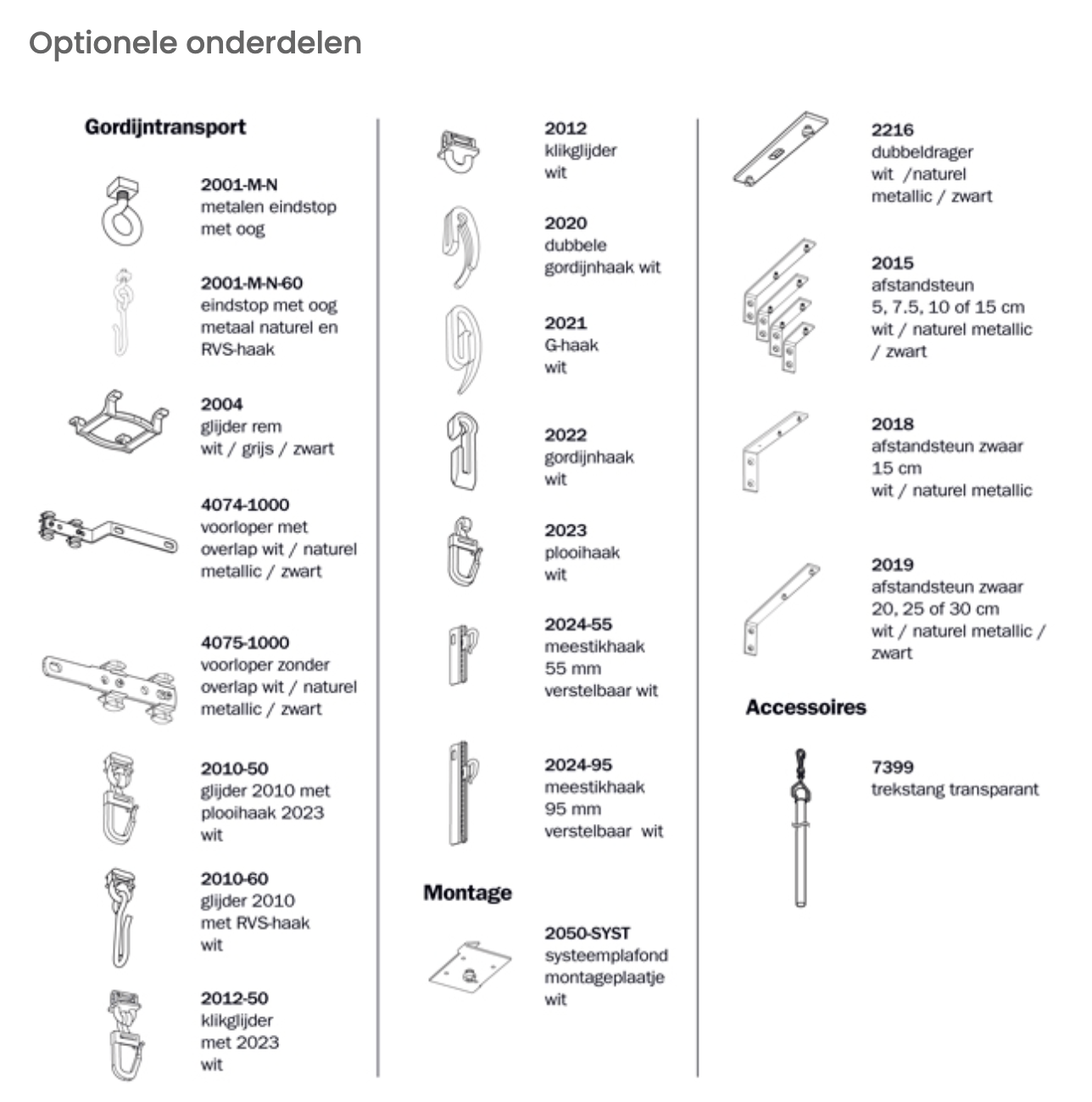 Glijder 2010 is verkrijgbaar met diverse haaksoorten. Metalen eindstop met oog 2001-M-N. Glijderrem 2004. Overlapbeugels 4074-1000 en 4075-1000.