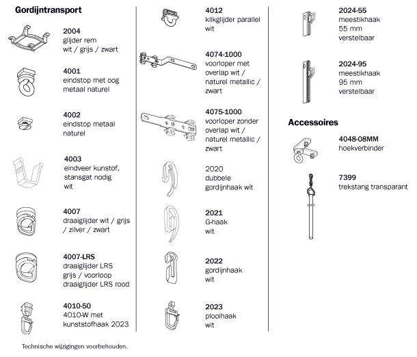 Glijder 4010 is verkrijgbaar met diverse haaksoorten. Glijderrem 2004. Eindveer 4003. Overlapbeugels 4074-1000 en 4075-1000.