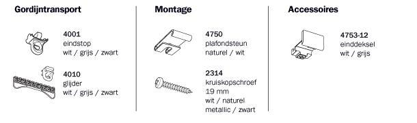 Bij niet-geponste rail: plafondsteun 4750. Aantal afhankelijk van systeemlengte.Overig toebehoren en montage: