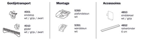 Glijder 4010 is verkrijgbaar met diverse haaksoorten. Eindstop metaal met of zonder oog. LRS glijders 4007-LR of Heavy Duty glijder 4020. Glijderrem 2004. Eindveer 4003. Overlapbeugels 4074-1000 en 4075-1000.