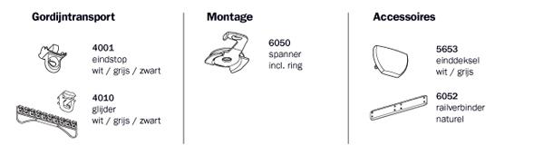 Glijder 4010 is verkrijgbaar met diverse haaksoorten. Eindstop metaal met of zonder oog. LRS glijders 4007-LR of Heavy Duty glijder 4020. Voorsprongglijder 6010. Glijderrem 2004. Voorloper met overlap 4074-1000 of zonder overlap 4075-1000. Plafondmontage op metalen steun 6055-1000. Blindmontage met profiel insert 6055-2000 (voorboren profiel door Goelst).
