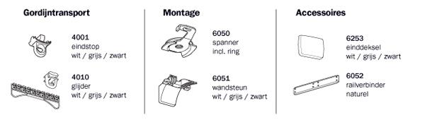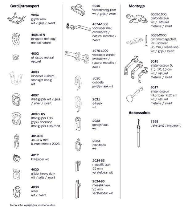 Glijder 4010 is verkrijgbaar met diverse haaksoorten. Eindstop metaal met of zonder oog. LRS glijders 4007-LR of Heavy Duty glijder 4020. Voorsprongglijder 6010. Glijderrem 2004. Voorloper met overlap 4074-1000 of zonder overlap 4075-1000. Plafondmontage op metalen steun 6055-1000. Blindmontage met profiel insert 6055-2000 (voorboren profiel door Goelst).