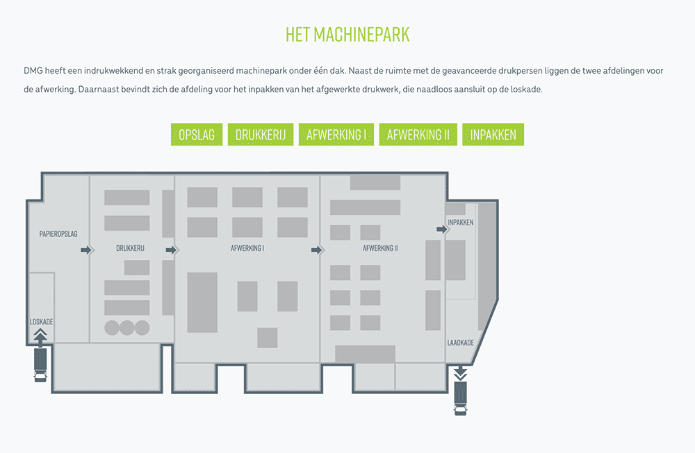 Daneels Media Group heeft een indrukwekkend en strak georganiseerd machinepark onder één dak. Aan de hand van een interactieve plattegrond kan je zien hoe de ruimte is ingedeeld en welke uitrusting zich in de verschillende afdelingen bevindt.