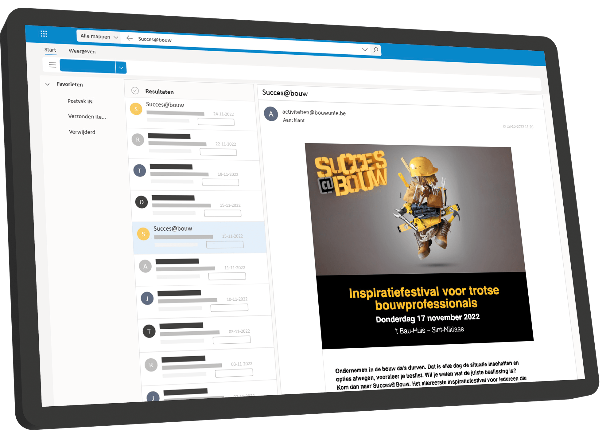 Gedurende de campagne stuurde we enkele e-mails naar de doelgroep. De inhoud van de e-mails was afgestemd op de timing van de campagne. Omdat het een eerste editie van het evenement is, is het belangrijk om mensen voldoende te laten kennismaken met het nieuwe concept. In een later stadium lag de focus op ervoor zorgen dat mensen zich inschreven voor het inspiratiefestival.