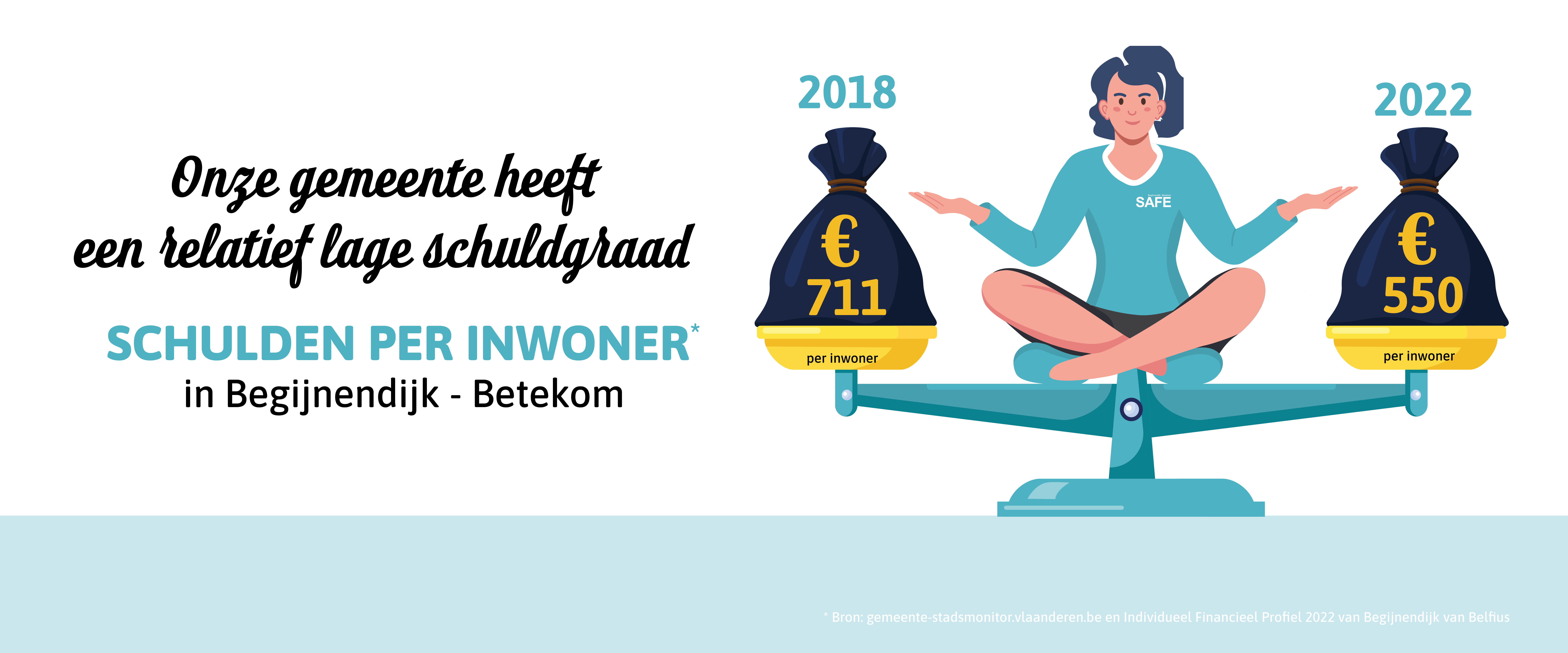De laatste zes jaar investeerden we in infrastructuur, menselijk kapitaal en een gedragen sociaal beleid. Het resultaat: een gezond financieel beleid met behoud van belastingdruk. Ook de volgende zes jaar willen we ervoor zorgen dat de financiële situatie van Begijnendijk-Betekom evenwichtig blijft. Daarvoor houden we onze schuldgraad, die momenteel relatief laag is, nauwlettend in de gaten. En nemen we onze keuze inzake financiën weloverwogen en met de nodige zorg op in onze meerjarenplanning.