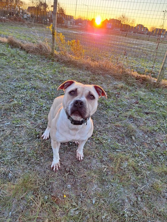Deze prachtige meid is Zina, een ontzettend lief pitbull teefje geboren op 5/4/2021. Zij werd in beslaggenomen met een 10-tal anderen pitbulls omwille van slechte huisvesting, ze leefden allemaal in vieze hokken. SCSP kon vijf van hen ophalen, gelukkig zijn ze gespaard gebleven van verkeerde bedoelingen.