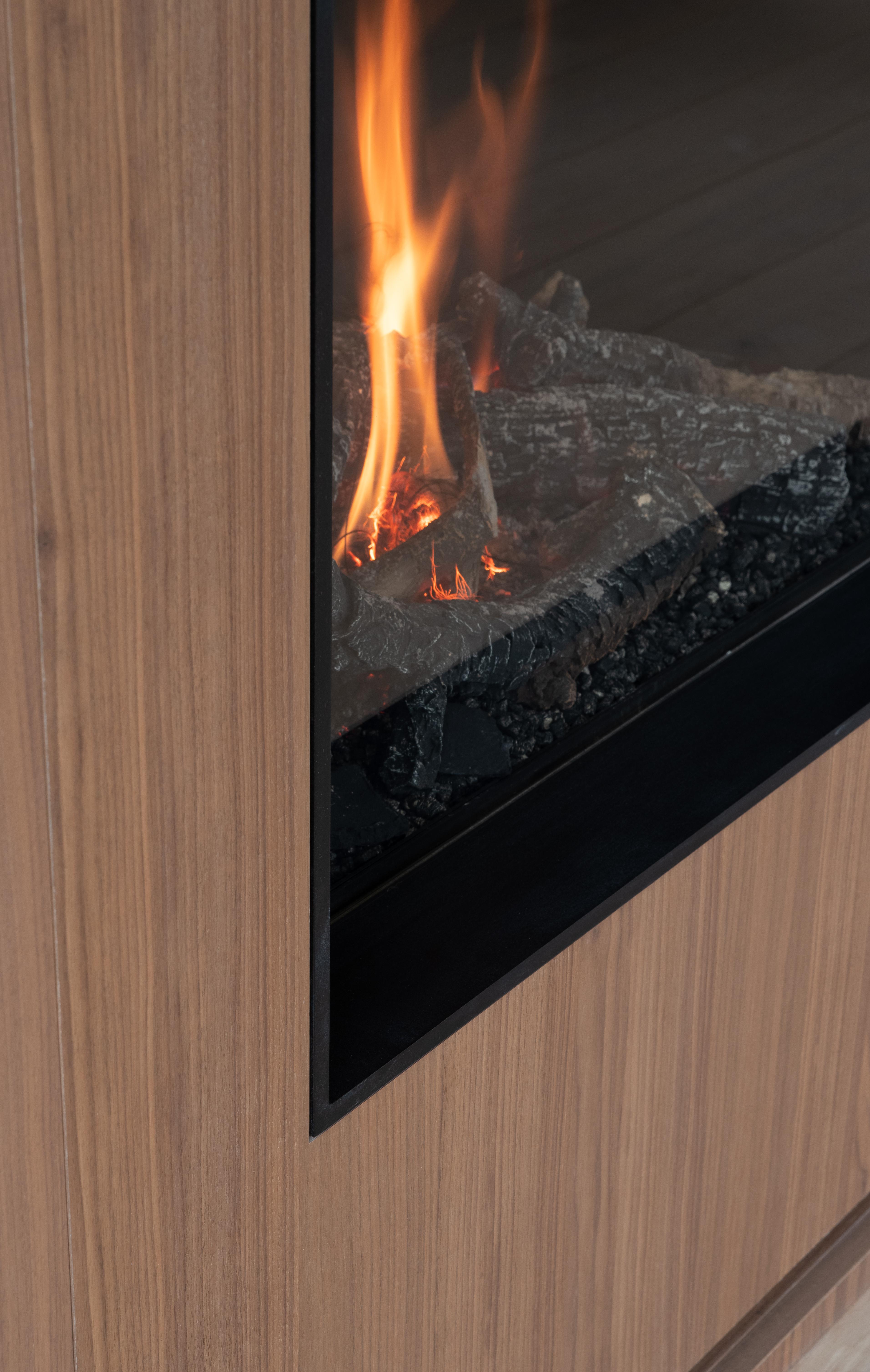 Deze wand werd volledig voorzien in notelaar hout, zo kreeg het geheel een warme uitstraling. Door een vierkante gashaard met houtdecoratie te plaatsen krijgt de ruimte een mooie invulling. De legplanken werden met zwart afgeplakt om een speelsheid te creëren.