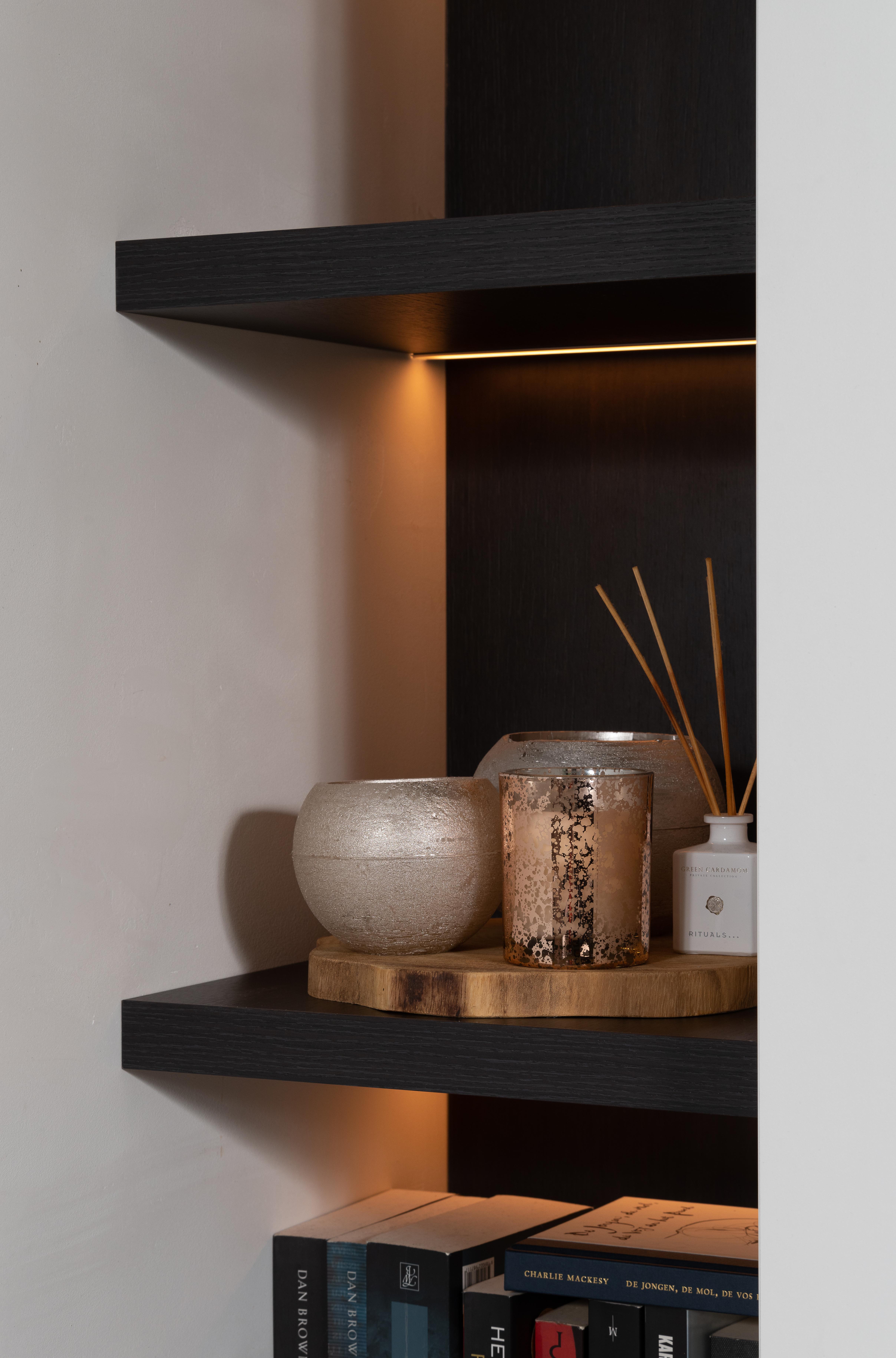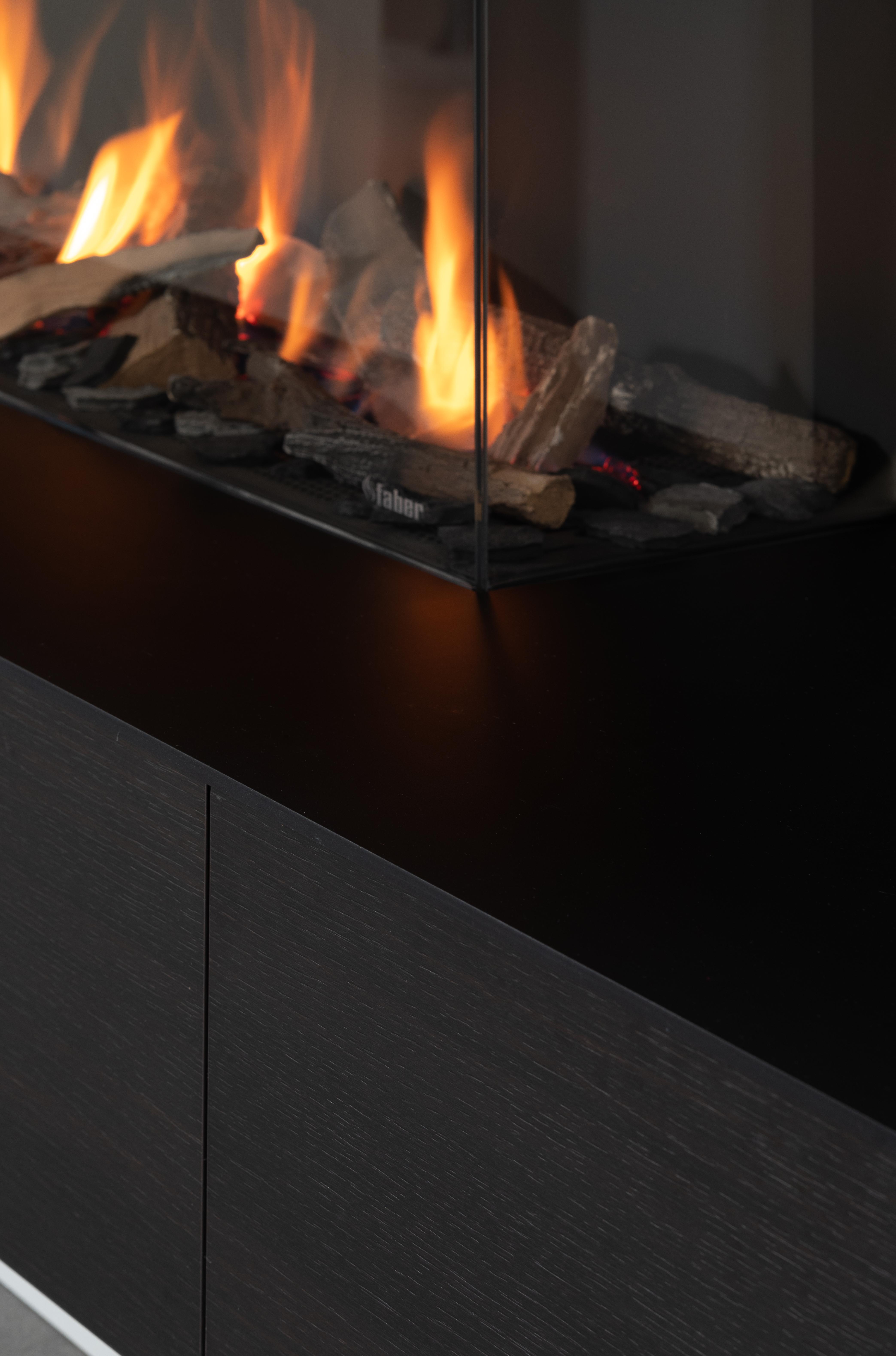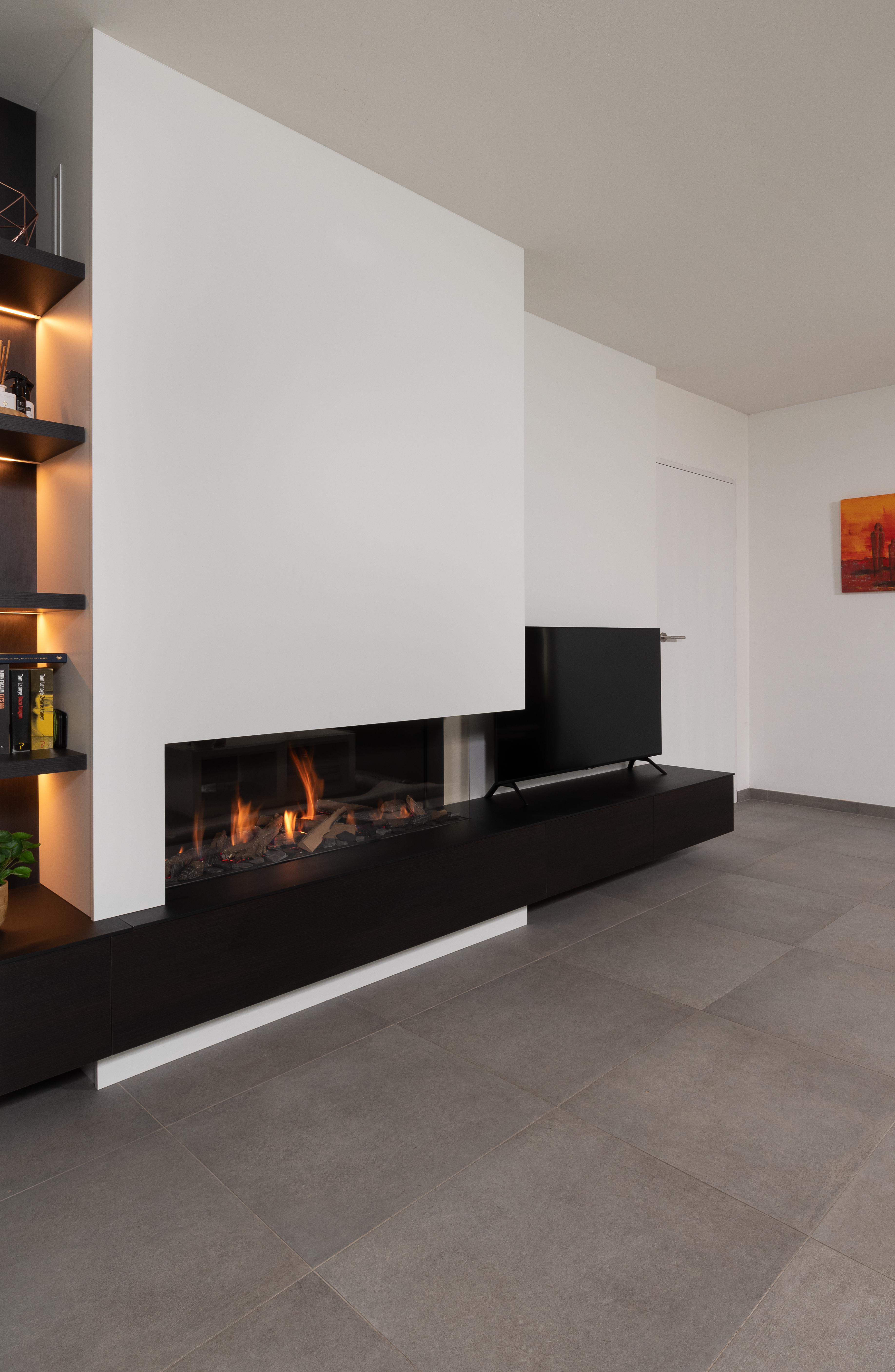 We zien hier een hoekhaard van Faber, ingewerkt in een MDF mantel. De gashaard bevat een houtset in combinatie met grijze stenen. De onderkast werd uitgewerkt in zwarte laminaat met een tablet in staal. In de nis hebben we planken geïnstalleerd als eyecatcher, mét ledverlichting.