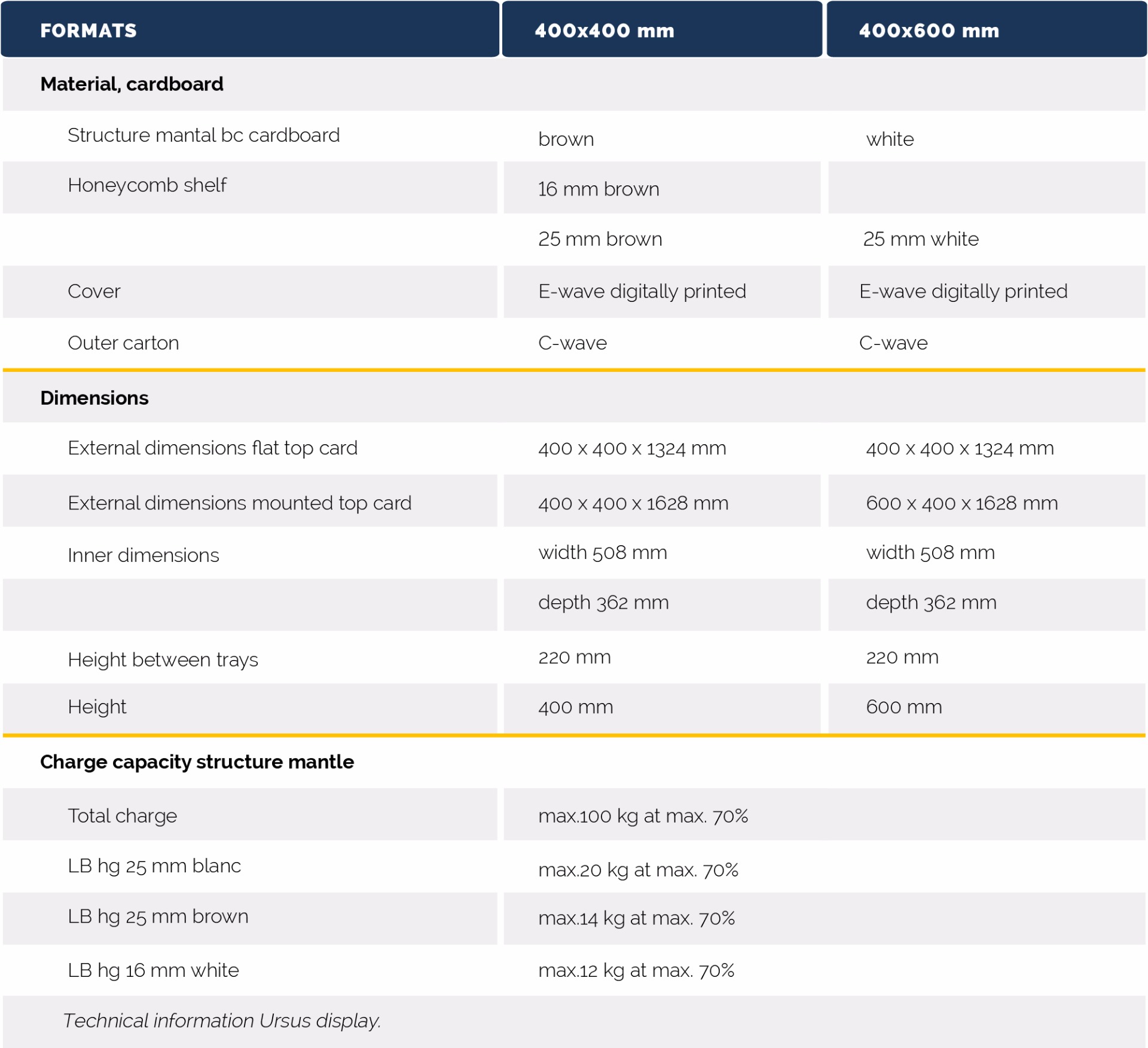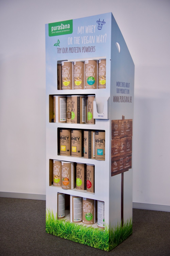 An Ursus display shines in all its simplicity. It consists of only three parts, which you can set up very quickly. The internal structure and shelves are made of two types of sturdy cardboard. The displays come in two sizes: 40 x 40 and 40 x 60. You determine everything else yourself. So, let your creativity run wild.
