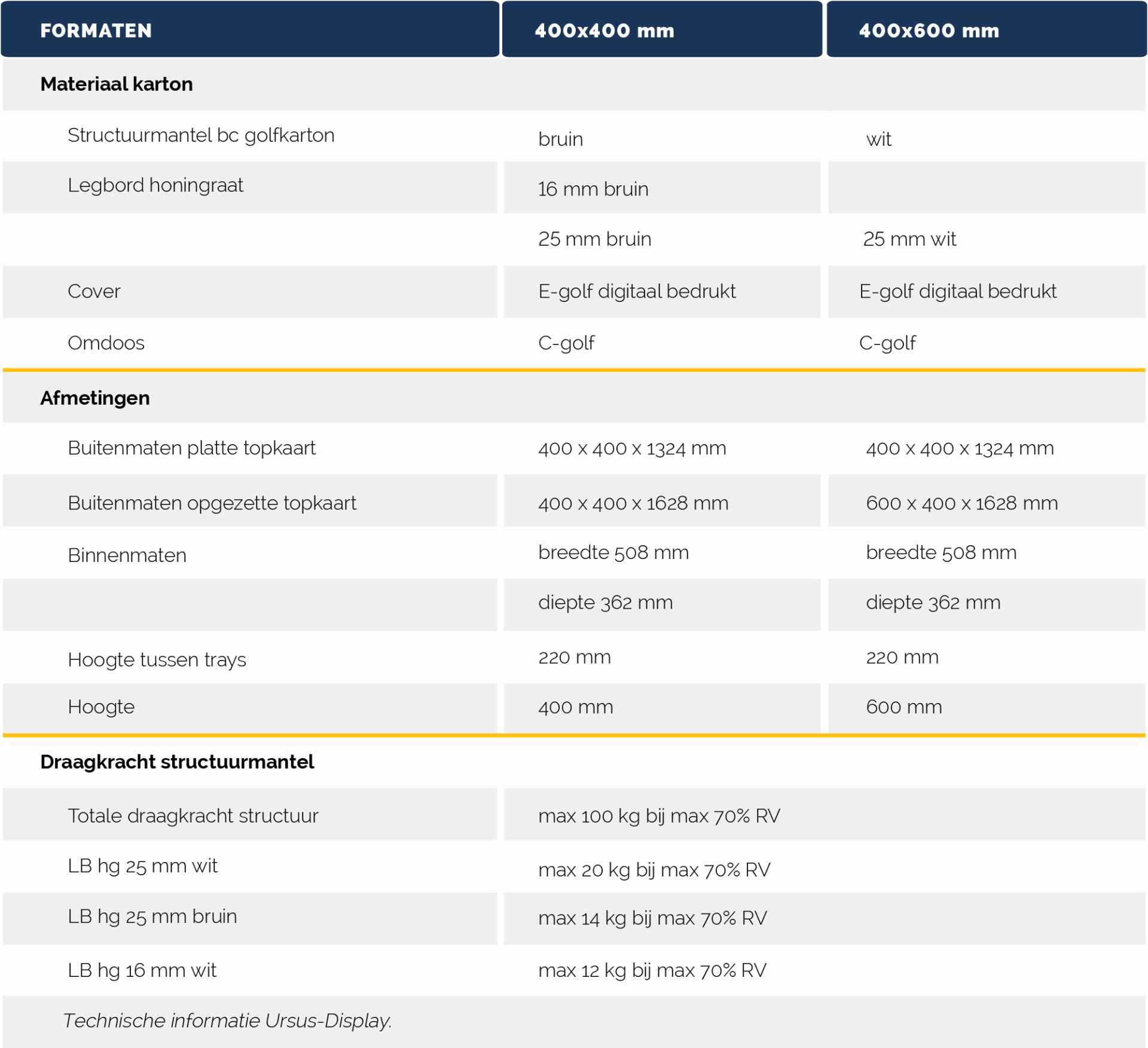 Een Ursus-display schittert in al z’n eenvoud. Hij bestaat uit slechts drie onderdelen, die je razendsnel in elkaar zet. De binnenstructuur en legborden bestaat uit twee soorten stevig karton. De displays bestaan in twee formaten: 40 x 40 en 40 x 60. Al het overige bepaal jij zelf. Laat je creativiteit dus de vrije loop.