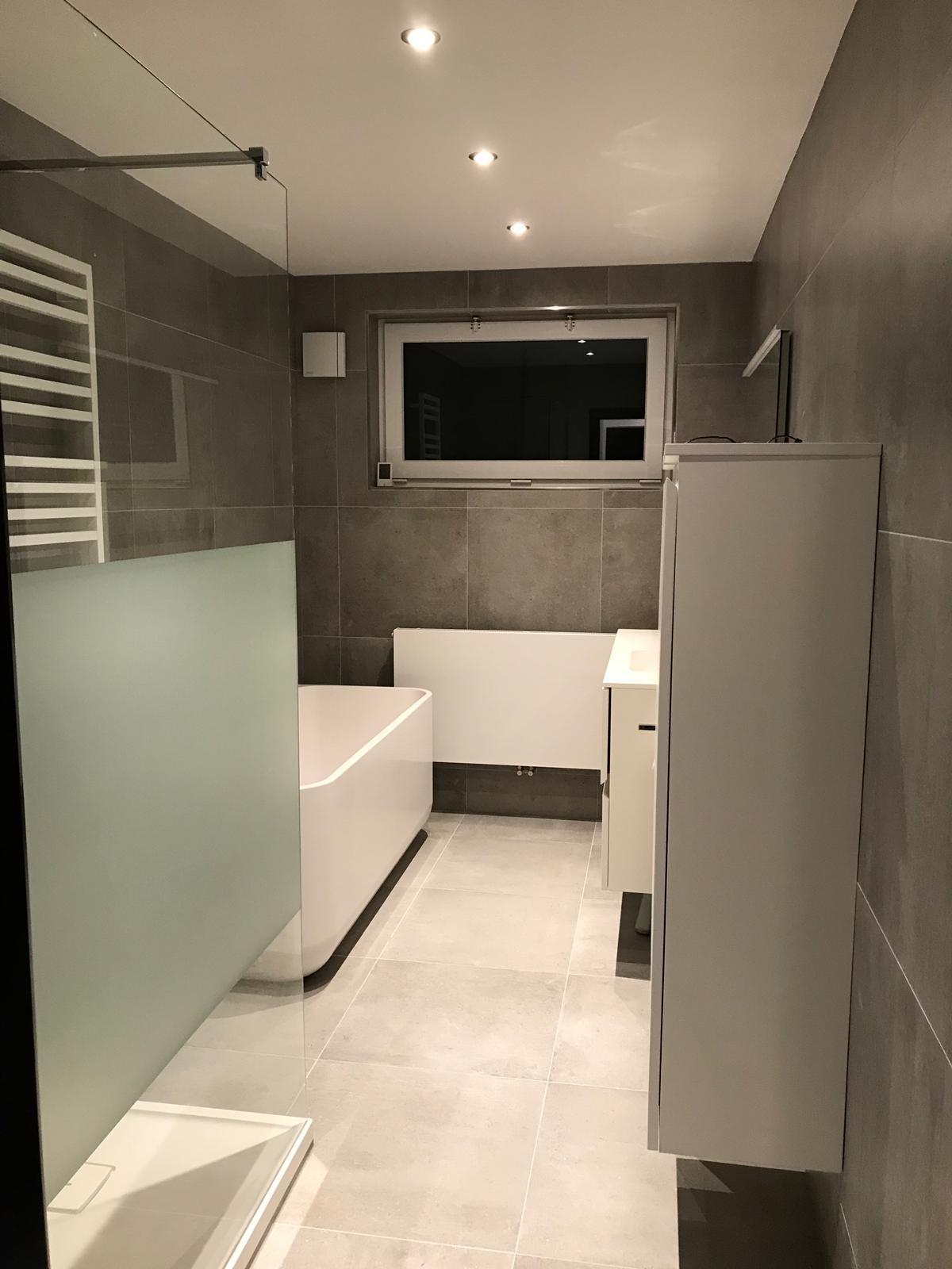 Hier te Hoboken werd ons gevraagd om de oude badkamer eens aan te pakken. Grondig, afbraak tot de kale muren.. Aanpassen van alle leidingen sanitair en elektriciteit en afgewerkt met nieuwe pleister, chape, plafond en tegels. Uiteraard de gekozen sanitaire toestellen en meubels werden netjes geïntegreerd.