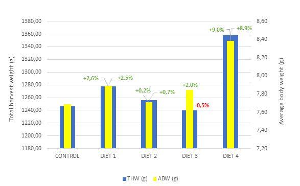 Après avoir effectué les essais, nous allons analyser les résultats et dresser des rapports. Comme mentionné ci-dessus, nous testons généralement quatre régimes alimentaires différents. Dans le graphique ci-dessous, nous avons testé cinq régimes alimentaires différents. Les barres jaunes indiquent la masse corporelle moyenne (ABW) des crevettes. Les barres bleues représentent quant à elles la biomasse totale (THW) par traitement. Cet essai révèle que le quatrième régime alimentaire s’en est bien mieux sorti que les autres. Nous comparons également chaque régime avec un régime de contrôle.