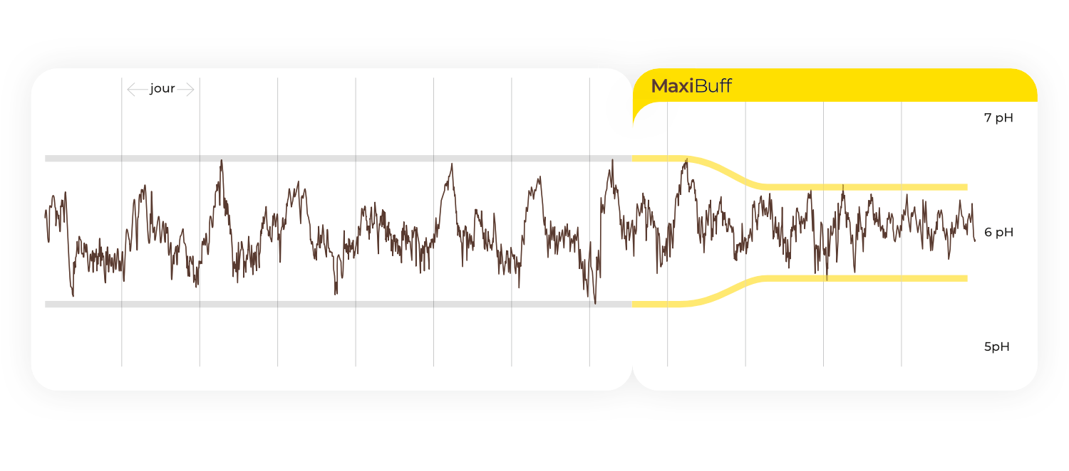 L’ajout d’un tampon ruminal a permis de réduire les valeurs d'amplitude. Le pH n’est plus descendu aussi bas, et a par ailleurs atteint des valeurs moins élevées, avec pour résultat un rumen plus sain. Ces résultats montrent que les tampons ruminaux sont un puissant outil contre l'acidose du rumen. Les 150 g de Maxibuff ont donné des résultats similaires aux 250 g de bicarbonate de sodium. Par rapport à la ration témoin, l’amplitude de variation était légèrement supérieure, ce qui montre que d'autres mesures doivent absolument être prises au niveau de l'alimentation et la gestion dans une approche globale de ce problème d'acidification du rumen.