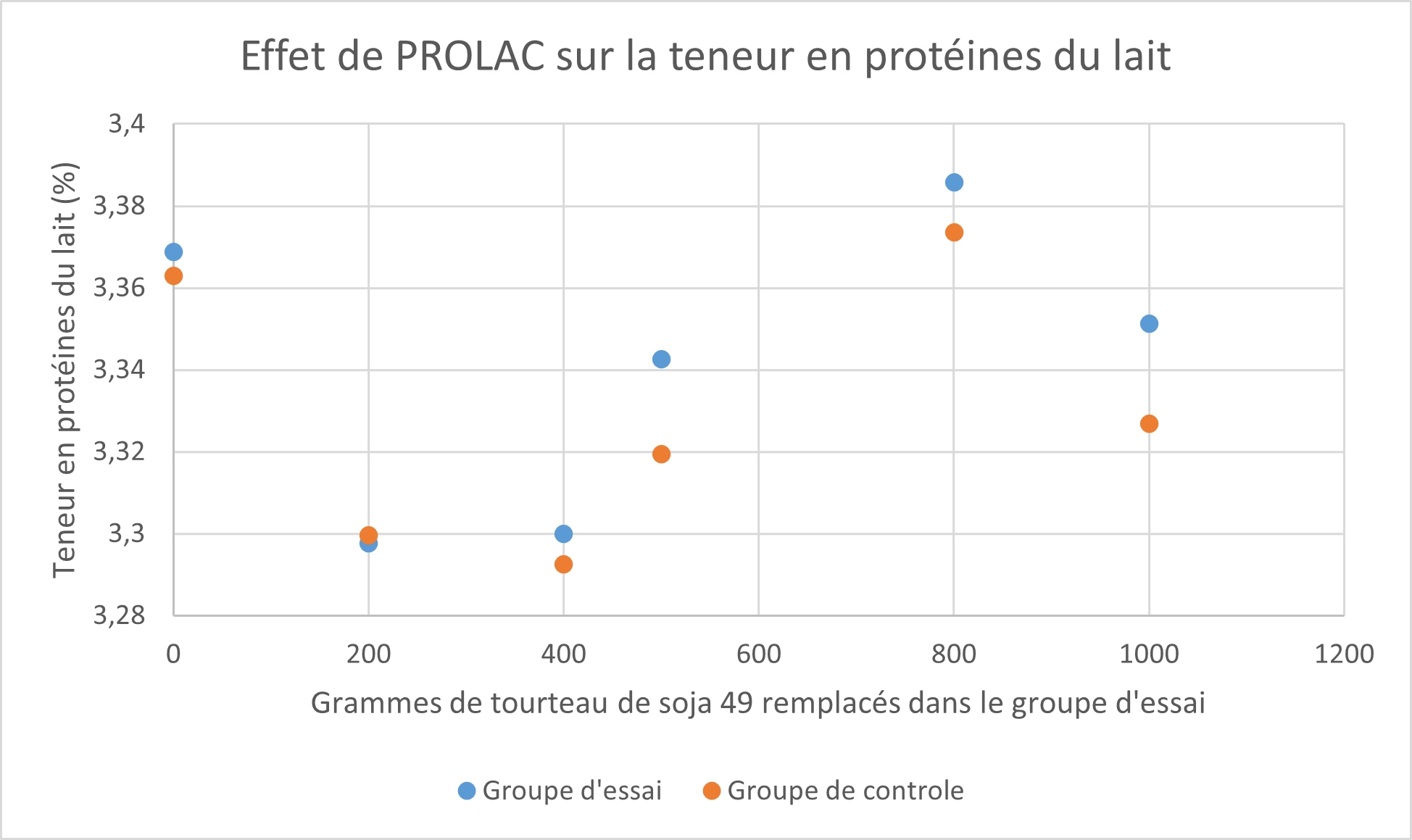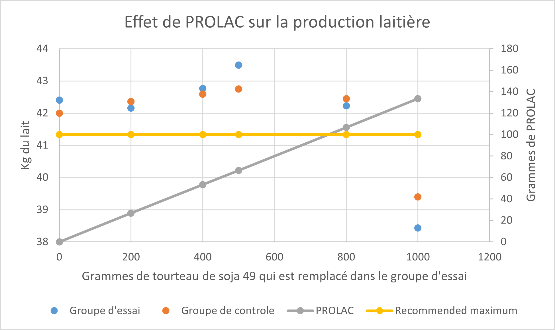 PROLAC est un additif qu’il faut ajouter chaque jour à la ration des vaches laitières, à raison de 100 grammes par vache. Il remplace les matières premières riches en protéines, comme le soja, et garantit une utilisation plus efficace des protéines par la vache laitière. La vache souffre moins de perte d’énergie due à la libération de méthane, et l’additif stimule en outre l’appétit. L’additif fera produire davantage de protéines du lait à la vache, ce qui entraînera en fin de compte une production de lait plus élevée. PROLAC permet d’apporter suffisamment de protéines et d’énergie au niveau de l’intestin grêle de vos vaches laitières. Cela améliore le taux de conversion alimentaire. Pas mal, non?