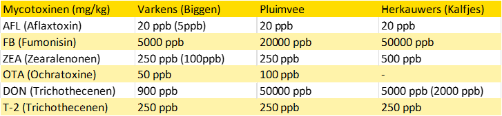 Hieronder zijn richtwaarden weergegeven van gehaltes die toegelaten zijn in de verschillende diersoorten :