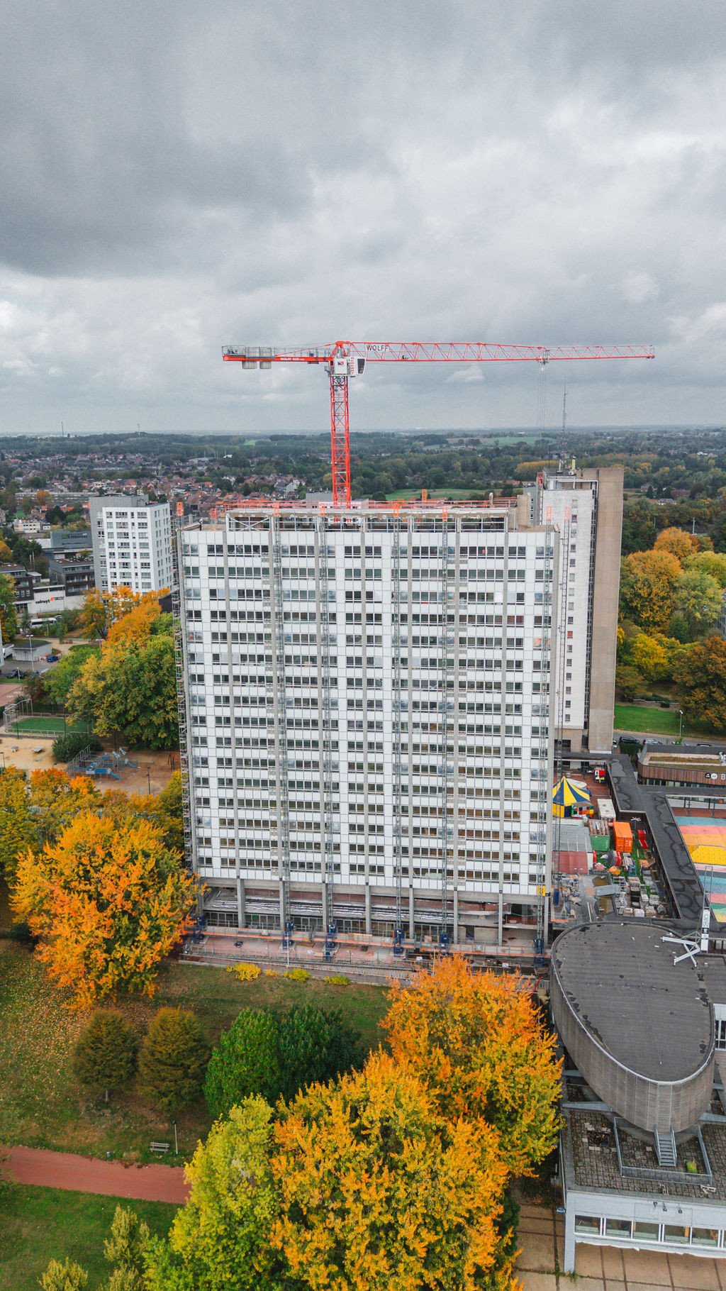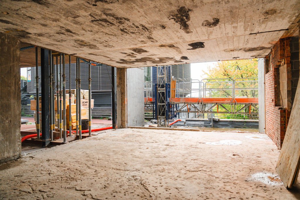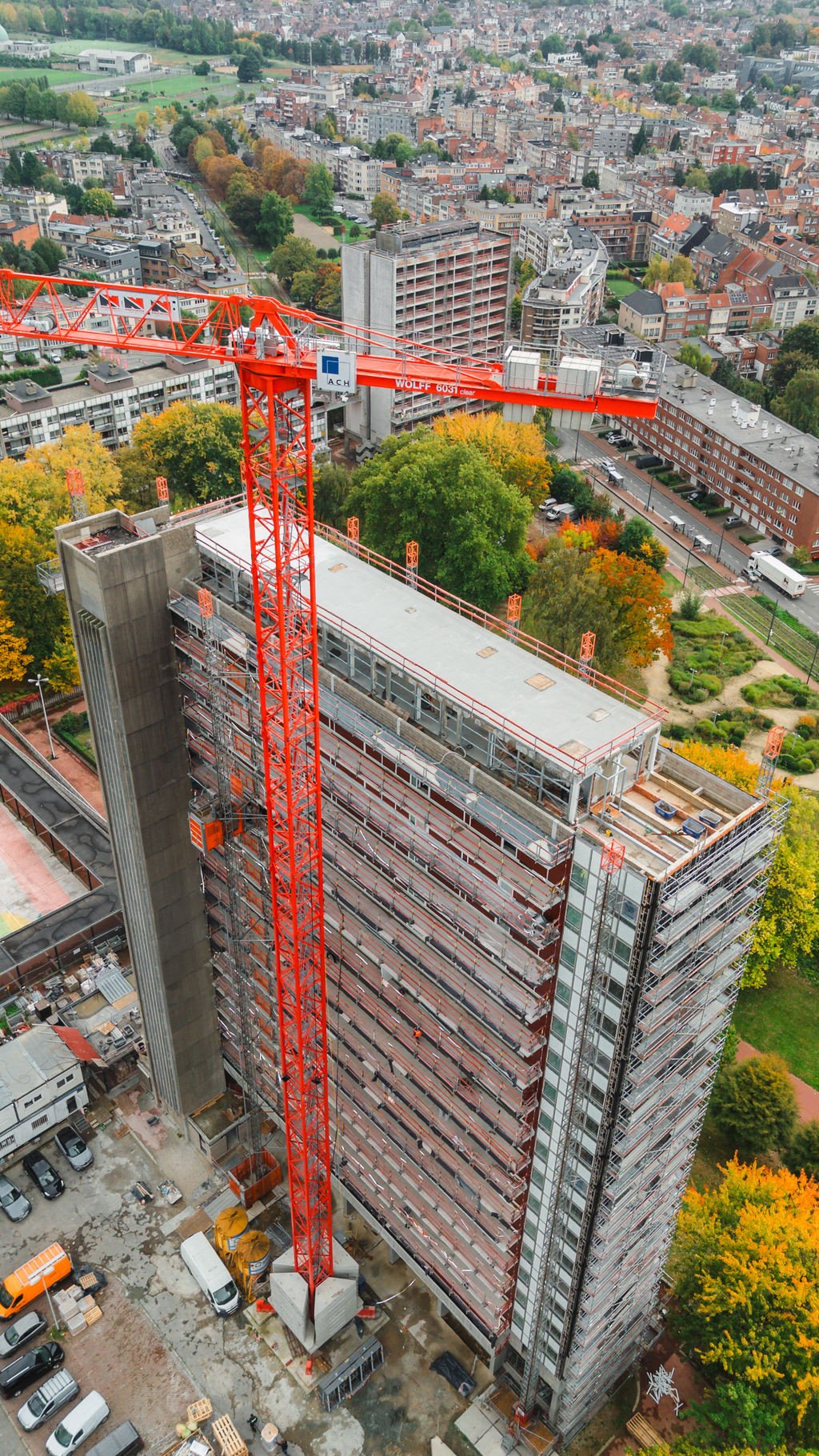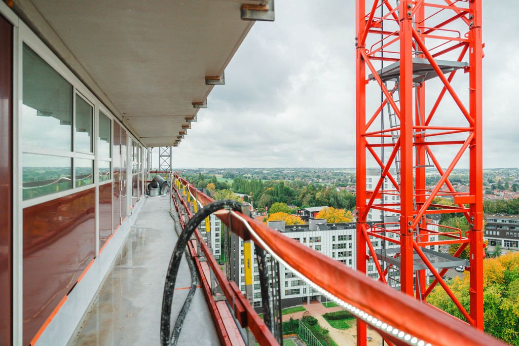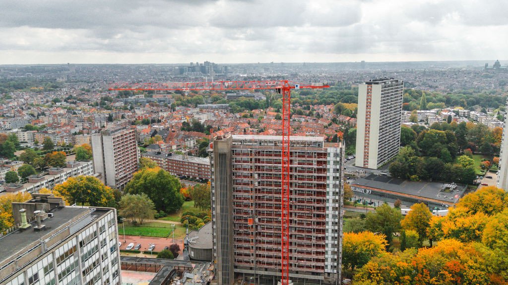 L’immeuble sera désamianté, complètement évidé et mis à nu (façades, toitures, aménagement intérieur et finition, installations techniques) et les coursives ainsi que l'escalier de secours extérieur seront remplacés par de nouveaux éléments en béton. L’enveloppe de l’immeuble sera pourvue d’une nouvelle menuiserie en aluminium (profils à 3 chambres, vitrage HR) ; placement d’isolation à haute performance derrière des panneaux de façade composites ; rénovation de la couverture de toiture avec isolation thermique supplémentaire.