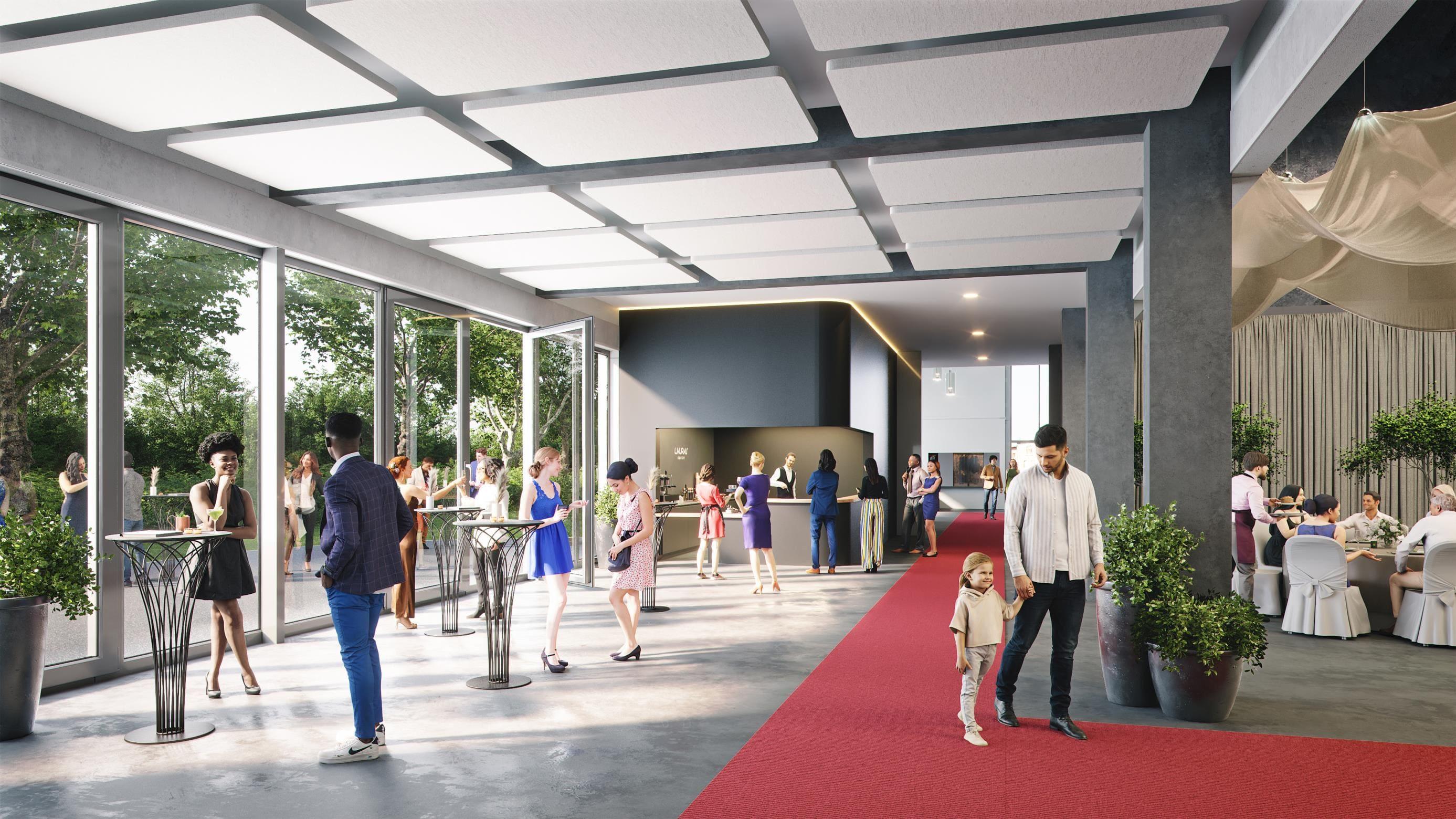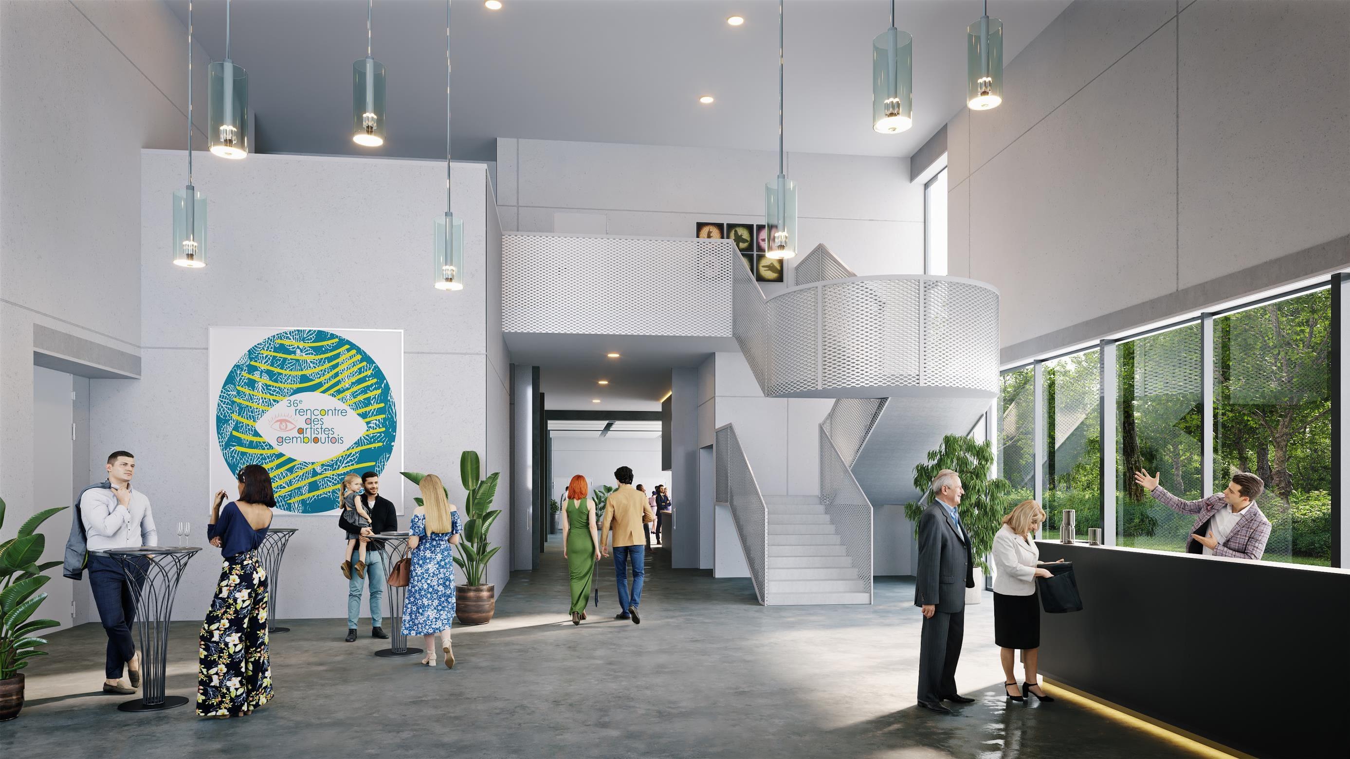 De ingang wordt gemarkeerd door een luchtige ontvangstruimte, waar bezoekers kunnen afspreken voordat ze de verschillende ruimtes betreden. Een bar, grenzend aan de grote zaal, zal ook worden ingericht om te voldoen aan de behoeften van feestelijke of culturele evenementen. Daarnaast worden er kantoren voor het personeel in het complex geïntegreerd, zodat er een functionele werkruimte ontstaat die bevorderlijk is voor het dagelijkse beheer van de activiteiten van het Centrum. Er zullen ook vergaderruimtes beschikbaar zijn voor iedereen.