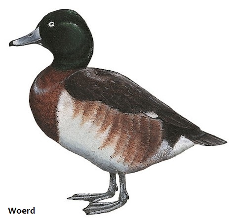 Zijn kleine compacte eendjes met een zeer donkere algemene kleur en een grote witte vleugelbalk, zichtbaar tijdens de vlucht. de woerd lijkt over het algemeen op de kuifeend.