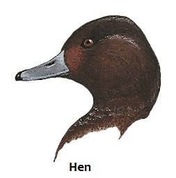 Het hennetje heeft een doffer kleur met zwartbruine kop overgaand in kastanjebruine borst en flanken.