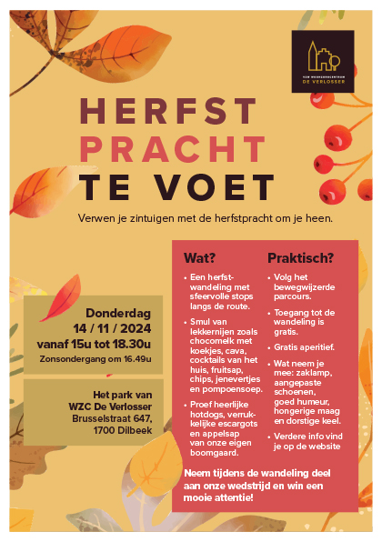 Op donderdag 14 november 2024 is het weer tijd voor onze jaarlijkse herfstwandeling. Tussen 15:00 en 18:30 uur ben je van harte welkom in het park van ons Woonzorgcentrum om samen te genieten van de prachtige herfstkleuren en sfeervolle stops langs de route.