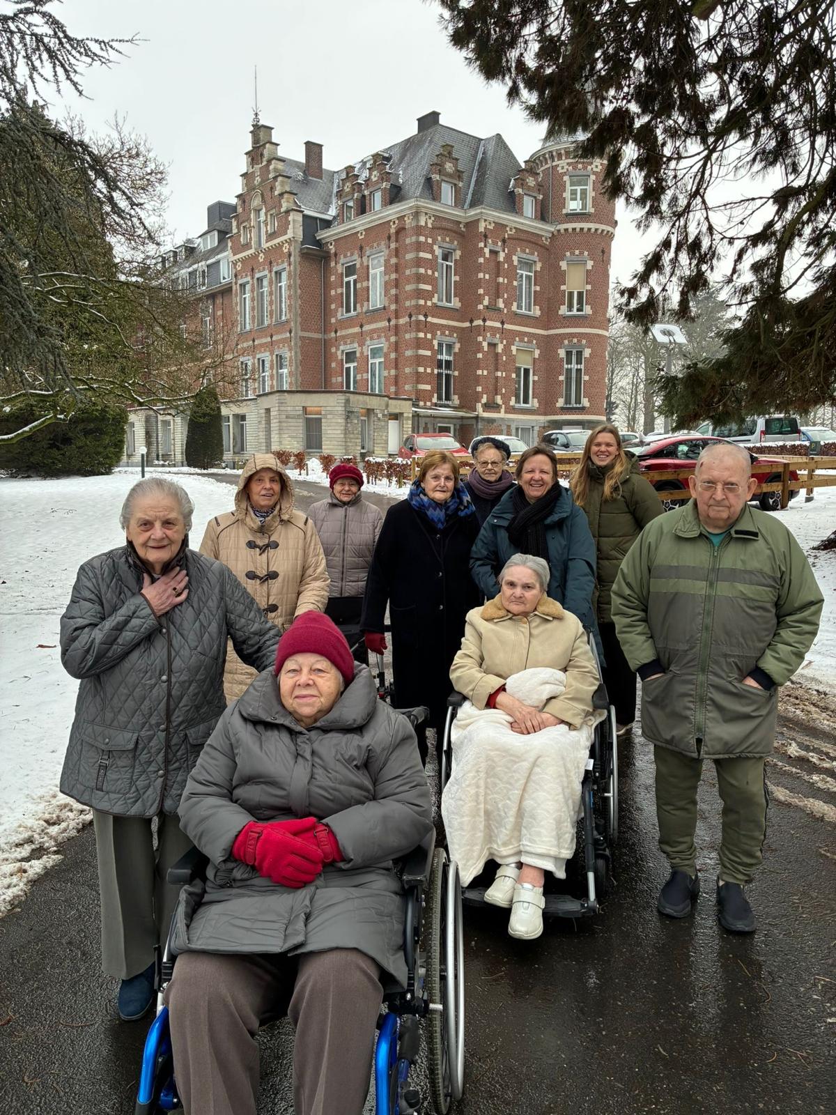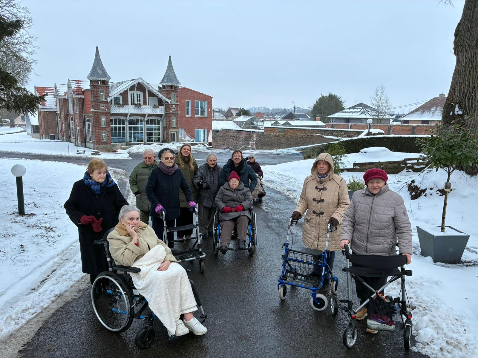 Samen met medewerkers maakten onze bewoners een rustige wandeling over het kasteeldomein. Sneeuw dempt geluiden, verzacht het landschap en nodigt uit tot vertragen. Er werd gelachen, herinneringen aan vroeger werden gedeeld en hier en daar bleef iemand even stilstaan om bewust te kijken, te voelen en te genieten.