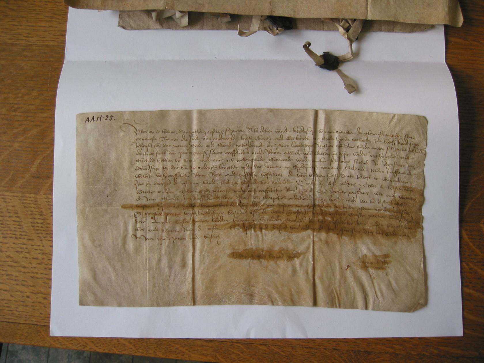 Het kerkarchief van Sint-Walburga zit vol verborgen schatten. Ondanks de naam, zijn in de archief ook stukken van andere archiefvormers verzeild geraakt. Deze oorkonde is er een voorbeeld van. In 1457 kocht ene Zegher Paesdach als deken van de broederschap van Sint-Genoveva een rente op een huis in de Einestraat, gelegen aan het waterschep, aan Willem van der Moten. Niet alleen de naam “Paesdach” is ongewoon voor Oudenaarde. De oorkonde bewijst ook dat naast Sint-Barbara een tweede broederschap actief was in de jonge Oudenaardse tapijtweverij.