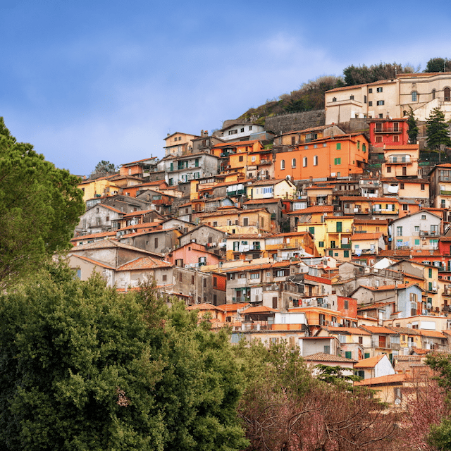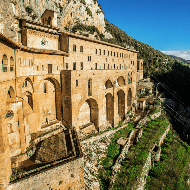 Nach Sperlonga geht es über ein Netz von hügeligen Provinzstraßen zurück ins Landesinnere. Das ist “langsames Reisen” in seiner besten Form. Wir machen uns auf den Weg zum Regionalpark Monti Simbruini, einem geschützten Gebiet mit Gipfeln bis zu 2000 Metern Höhe. Wegen der vielen Abteien und Klöster wird diese Region Latiums auch als “Sandelland” bezeichnet. Das Endziel dieser Etappe ist Subiaco, wo Benedikt ein Kloster um die Höhle herum errichten ließ, in der er nach seiner Flucht aus dem dekadenten Rom jahrelang lebte. Das Kloster ist ein beeindruckendes Bauwerk, das am Rande einer Schlucht in den Fels gehauen wurde. Aber Subiaco ist auch ein sehr schönes Dorf, in dem es sich gut leben lässt. Unten, am Ufer des Flusses, befindet sich ein großer Parkplatz, auf dem Sie Ihr Wohnmobil, Auto oder Motorrad abstellen können.