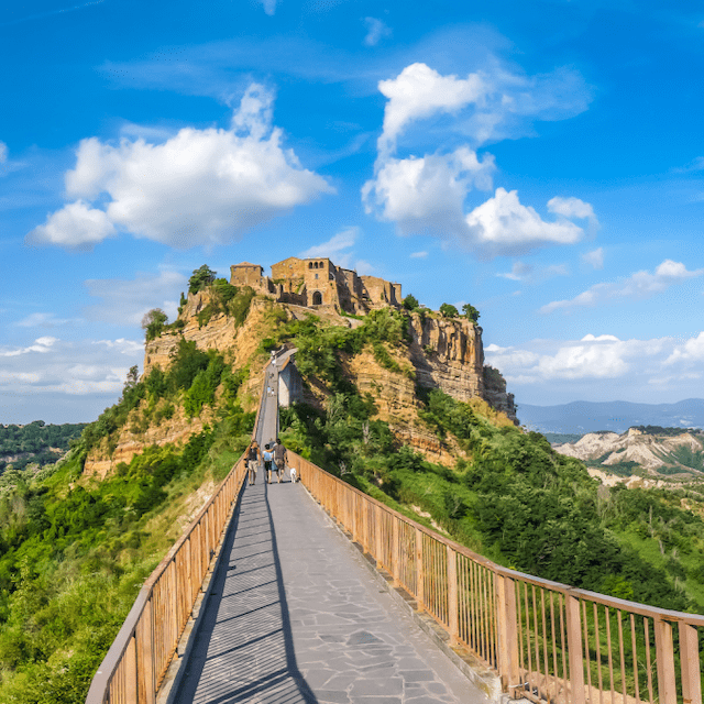 Wenn Sie Bolsena verlassen, stellen Sie Ihr GPS auf “Bagnoregio” ein und genießen die kurvenreiche Straße durch eine trockene Hügellandschaft. In Bagnoregio folgen Sie den Hinweisschildern “Civita di Bagnoregio”, bis Sie den Parkplatz für Busse und Wohnmobile am unteren Ende des Zentrums von Bagnoregio sehen. Hier können Sie Ihre Eintrittskarte für die Besichtigung der Burg kaufen, die auf der Liste der “schönsten Zitadellen Italiens” steht. Nach einem angenehmen Spaziergang durch den vorstädtischen Teil der Stadt (Dauer: 15') taucht in der Ferne das Schloss auf. Sie steht atemberaubend schön auf einem einsamen Felsen in der Landschaft und ist nur über eine Fußgängerbrücke zu erreichen. Obwohl die Burg den Spitznamen “die sterbende Stadt” trägt, ist sie immer noch bewohnt und es gibt einige Souvenirläden, Bistros und Gelaterias, in denen man sich in dieser historischen Umgebung entspannen kann.