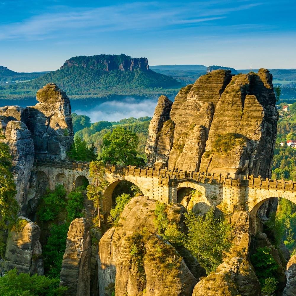 An der Grenze zwischen Deutschland und der Tschechischen Republik liegt der Nationalpark Sächsische Schweiz. Auf unserer Reise durch die Tschechische Republik haben wir diesen märchenhaften Naturpark bereits erkundet, aber auch der Teil in Deutschland ist einen Besuch wert. Lassen Sie das Auto oder Wohnmobil stehen und wandern Sie zwischen den steilen Felswänden, die wie Türme über den grünen Tälern aufragen. Genießen Sie die vielen atemberaubenden Ausblicke entlang des Weges und lassen Sie sich von den klaren Flüssen leiten, die durch die neblige Landschaft mit ihren Felsformationen fließen. Die berühmteste Sehenswürdigkeit ist die Felsformation Bastei. Diese Touristenattraktion ist zwar überfüllt, aber der Ausblick, den man bekommt, ist es wert. Etwas ruhiger geht es auf der anderen Seite des Flusses zu, wo man zwischen den Felsen spazieren gehen, picknicken und erfahrene Bergsteiger bewundern kann, die die Felsen bezwingen.