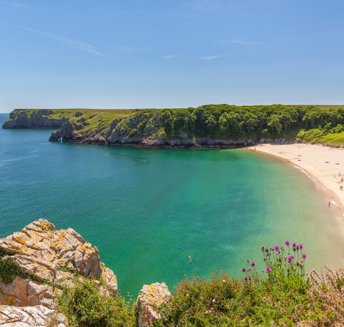 Wer weniger Zeit hat, kann die Route in Cardiff beenden, aber wir beschlossen, weiter nach Barafundle Bay zu fahren, vielleicht eines der bestgehüteten Geheimnisse von Wales. Die Bucht, die an eine griechische Insel erinnert, wurde kürzlich zu einem der schönsten Strände der Welt gekürt. Daher konnten wir uns dieses vielversprechende Ziel nicht entgehen lassen. Wir wurden nicht enttäuscht. Der von Dünen und Wäldern umgebene goldene Sand, umspült von kristallklarem, smaragdgrünem Wasser, ist der perfekte Ort zum Entspannen. Die sichelförmige Bucht ist unberührt und wird an beiden Enden von Kalksteinklippen begrenzt. Ein 20-minütiger Spaziergang zur Spitze der Klippe wird Sie mit der Aussicht auf die Küste überraschen. Ein bröckelnder Steinbogen und steile Steinstufen führen hinunter zum Strand.