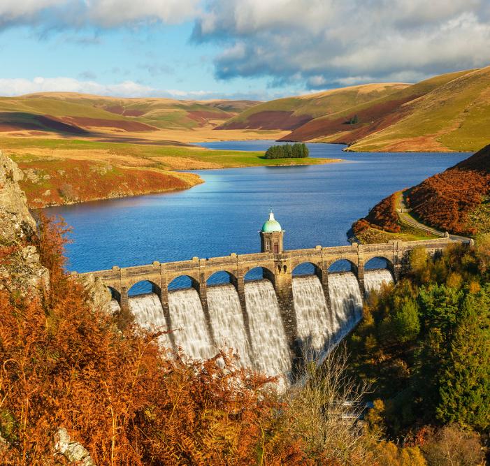 Das Elan Valley liegt in den Cambrian Mountains und ist ein wunderschönes, unberührtes Gebiet, das durch die Dämme und Stauseen, die die schöne, lebendige Landschaft prägen, noch attraktiver wird. Die Dämme und Stauseen wurden von den Viktorianern vor über 100 Jahren gebaut. Der Craig-Goch-Damm ist vielleicht der berühmteste. In dem Dorf Rhayader befindet sich das Elan Valley Visitor Centre. Halten Sie unbedingt an, bevor Sie der malerischen Bergstraße folgen, die an den Seen vorbeiführt. Elan ist ideal für Erkundungen zu Fuß oder mit dem Fahrrad. Im Zentrum von Rhayader können Sie Fahrräder ausleihen und sich über Wandertouren informieren.