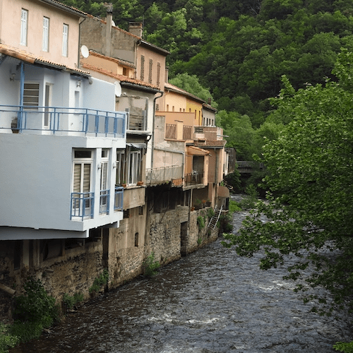 After Montségur, we headed south again towards the Pyrenees through the Catalan Pyrenees Regional Natural Park. Our next stop on the route was Pradès. However, we did the journey in 2 stages. The route through the nature park took much more time than we could have estimated beforehand. But it is well worth the drive! What nice roads, what beautiful views, what a fascinating landscape. We stopped along the way in Axat, a charming village on the river Aude. According to the information in the village, you can go rock climbing, abseiling, canyoning, hydrospeeding, rafting and mountain biking.