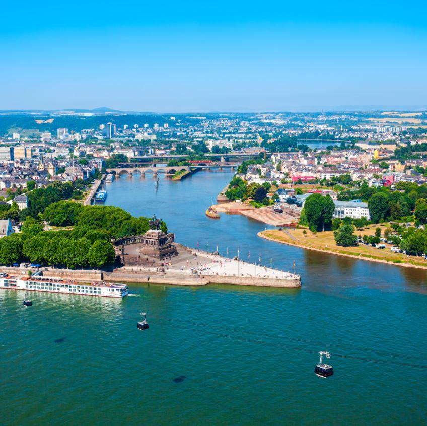 Koblenz, the starting point of this route, is also the end point of the Moselle. In this city, the Moselle flows into the Rhine. This confluence is marked by the artificial land tongue Deutsches Eck. The Kaiser Wilhelm Memorial, an equestrian statue in honour of Kaiser Wilhelm I, who was partly responsible for the unification of the German Empire, is also located here. Opposite the Deutsches Eck, on the right bank of the Rhine, is the Ehrenbreitstein Fortress from the 19th century, which today serves as a museum, youth hostel and restaurant. In addition, there is a viewpoint in the fortress from where you get an endless view over the Moselle, the Rhine and the historic city centre of Koblenz. A cable car at the top of the hill takes you back to the left bank of the Rhine. On the way, you get a wonderful view of the Balduin Bridge, the Prussian government building and the city. In Koblenz you should plan at least two days. That way there is enough time to take a boat trip on the rivers and to visit the historical town centre with attractions such as the historical Am Plan square, the Saint-Kastor Basilica and the colourful half-timbered houses.