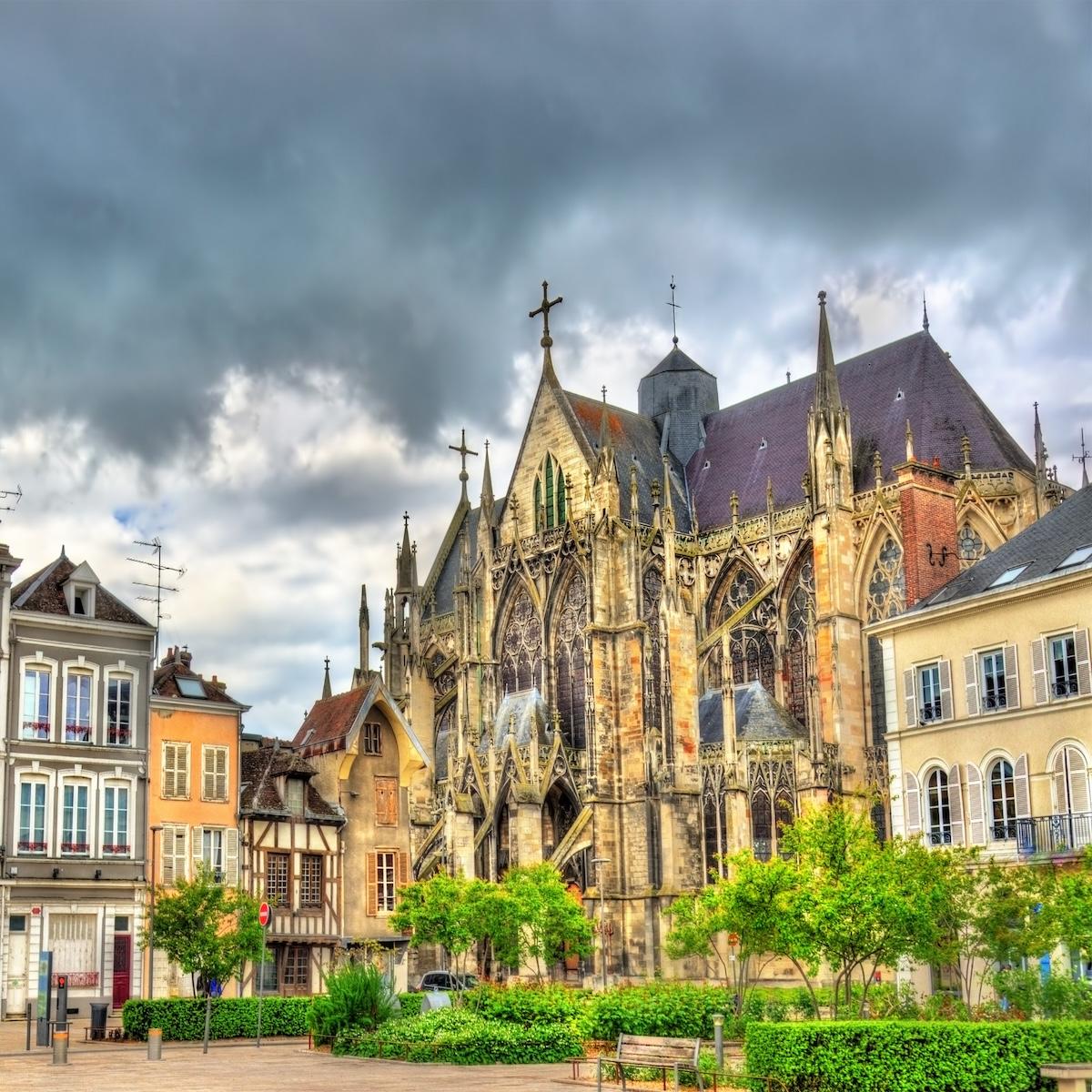 Troyes, de stad van de duizend kleuren en de historische hoofdstad van Zuid-Champagne. Het historische centrum heeft trouwens de vorm van een champagnekurk! In de Vroege Middeleeuwen had Troyes te kampen met invallen van Attila de Hun en slaagden de Vikingen er zelfs in de stad helemaal plat te branden. De stad bood woonst aan de middeleeuwse schrijver Chrétien de Troyes, pionier van de hoofse roman en grondlegger van de Arthurliteratuur. Dankzij de strategische ligging aan de Seine ontwikkelden zich tapijtateliers, molens, looierijen, weverijen en papierfabrieken in de stad. Later was vooral de textielindustrie belangrijk. Troyes wordt de stad van de duizend kleuren genoemd vanwege de schitterende vakwerkhuizen met hun kleurrijke gevels. De geheimzinnige steegjes nodigen uit voor een stadswandeling langs de Cathédrale St-Pierre-et-St-Paul, een imposant bouwwerk uit de 13e eeuw. Let er vooral op de indrukwekkende glas-in-lood-ramen uit zowel de middeleeuwen als de renaissance. In het oude bisschoppelijk paleis is nu het Musée d’Art Moderne gevestigd. Kortom, een dag in Troyes zal je niet vervelen.